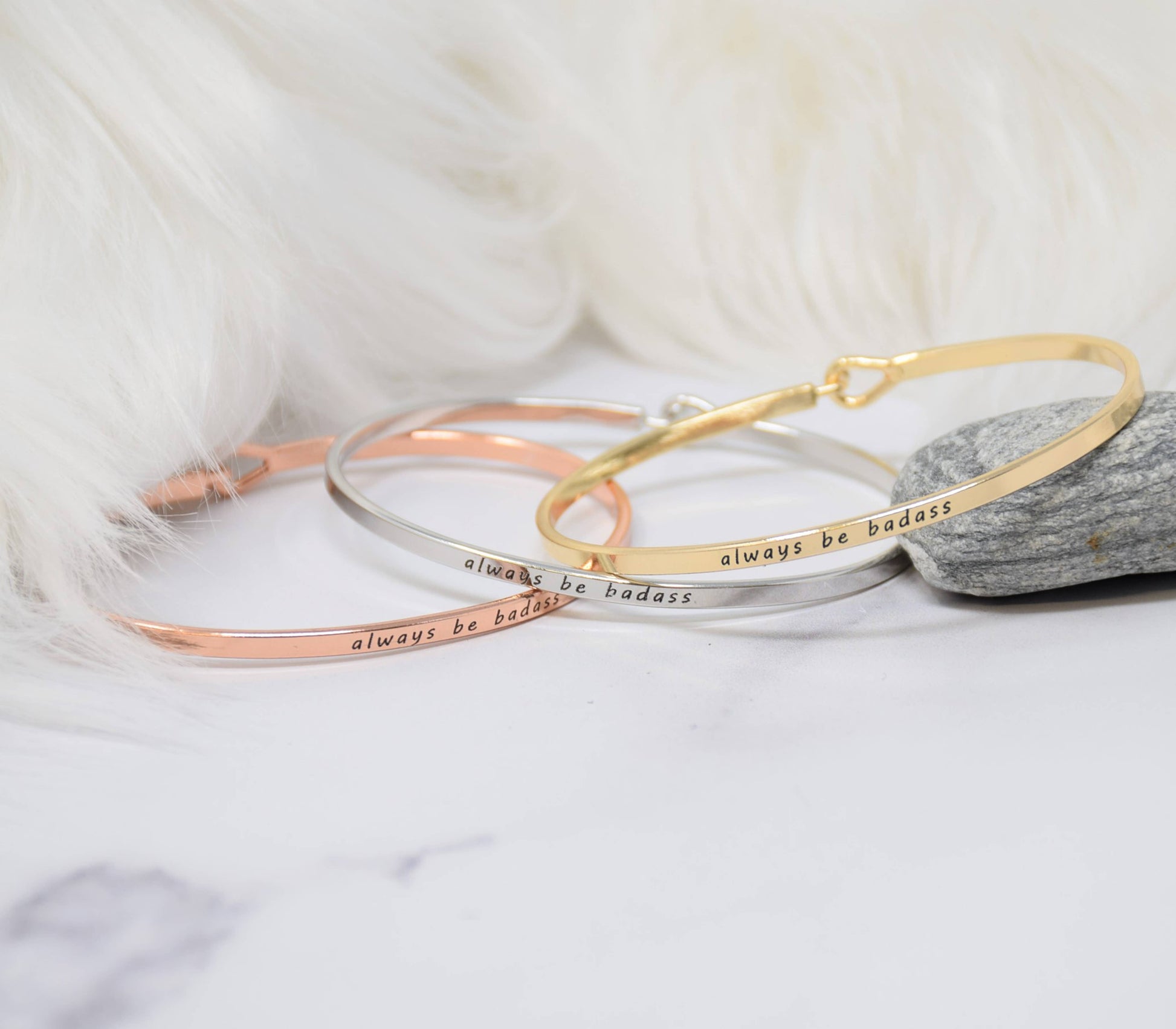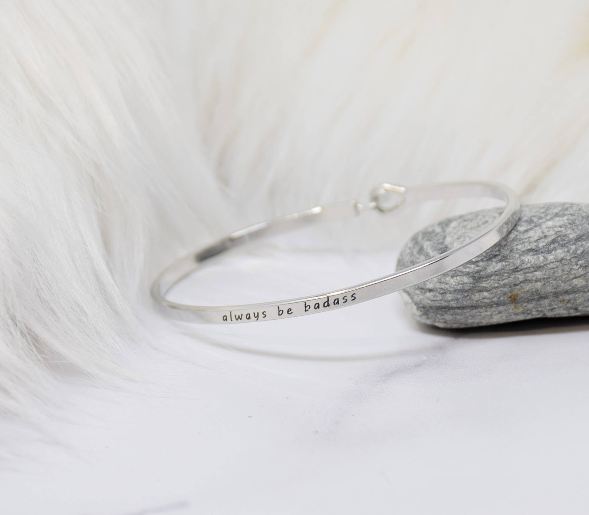 Always Be Badass Inspired Message Engraved Simple Bangle Bracelet. Inspirational bracelets that make for an excellent and meaningful gift for yourself, friends and loved ones. These are subtle, elegant, and beautiful alone or stacked creatively. We have an array of messages that you can mix and match to your heart's content. Wear it with purpose and care! Details: Premium high-quality band with hook closing Size: ranged from 1.5 mm thickness Diameter: 2.5 inches Circumference: fits up to 7 inches Wrist (please use a measuring tape to circle your wrist) Designed in the USA: Creative Messages This bracelet is made of and consists of a hook that is rhodium plated.