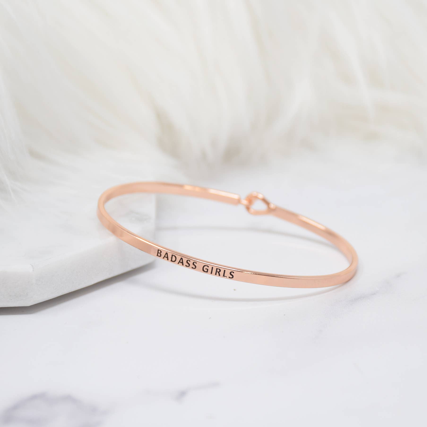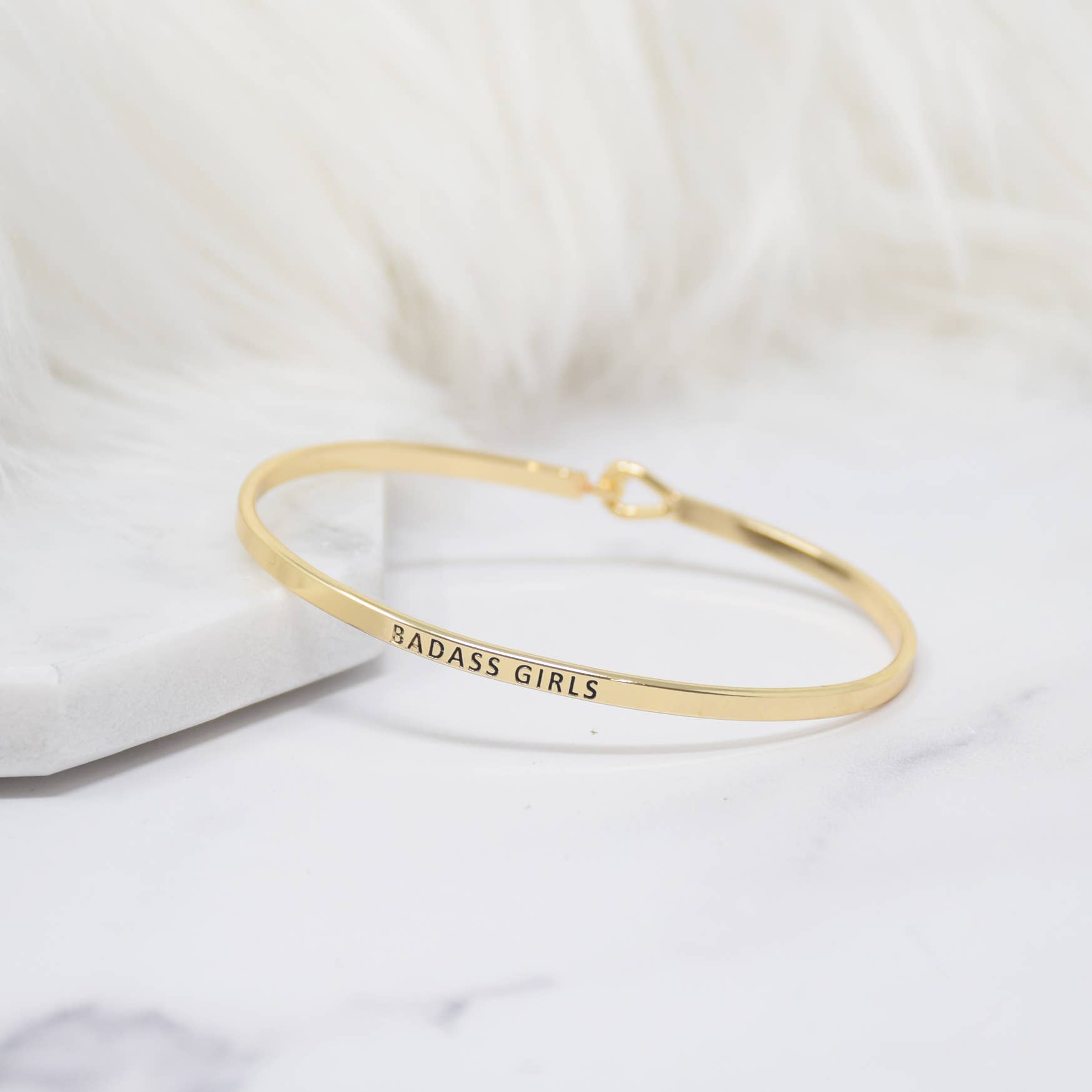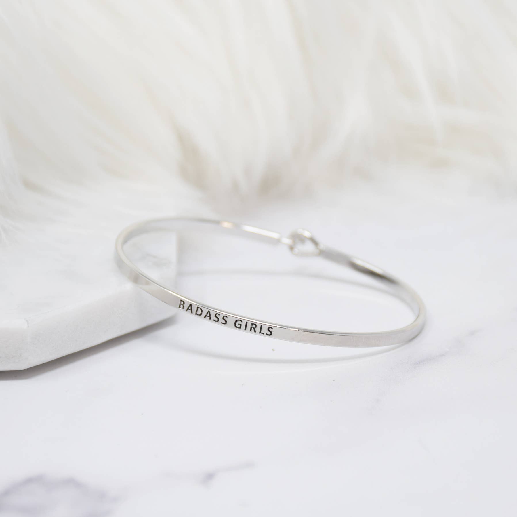 BADASS GIRLS Inspired Message Engraved Simple Bangle Bracelet. Inspirational bracelets that make for an excellent and meaningful gift for yourself, friends and loved ones. These are subtle, elegant, and beautiful alone or stacked creatively. We have an array of messages that you can mix and match to your heart's content. Wear it with purpose and care! Details: Premium high-quality band with hook closing Size: ranged from 1.5 mm thickness Diameter: 2.5 inches Circumference: fits up to 7 inches Wrist (please use a measuring tape to circle your wrist) Designed in the USA: Creative Messages This bracelet is made of and consists of a hook that is rhodium plated.