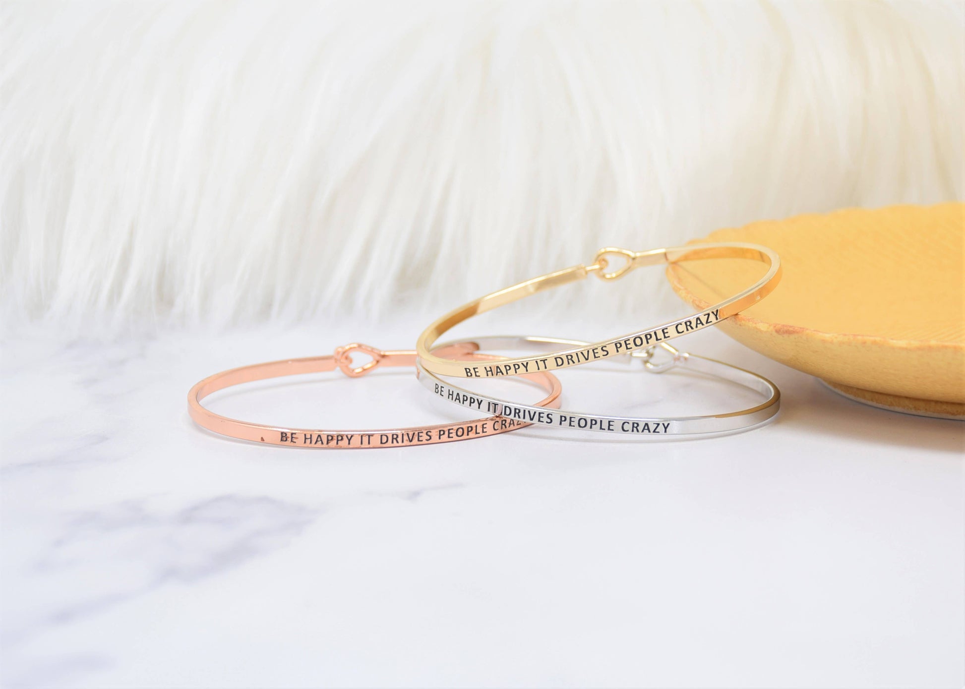 BE HAPPY IT DRIVES PEOPLE CRAZY Inspired Message Engraved Bangle Bracelet. Inspirational bracelets that make for an excellent and meaningful gift for yourself, friends and loved ones. These are subtle, elegant, and beautiful alone or stacked creatively. We have an array of messages that you can mix and match to your heart's content. Wear it with purpose and care! Details: Premium high-quality band with hook closing Size: ranged from 1.5 mm thickness Diameter: 2.5 inches Circumference: fits up to 7 inches Wrist (please use a measuring tape to circle your wrist) Designed in the USA: Creative Messages This bracelet is made of and consists of a hook that is rhodium plated.