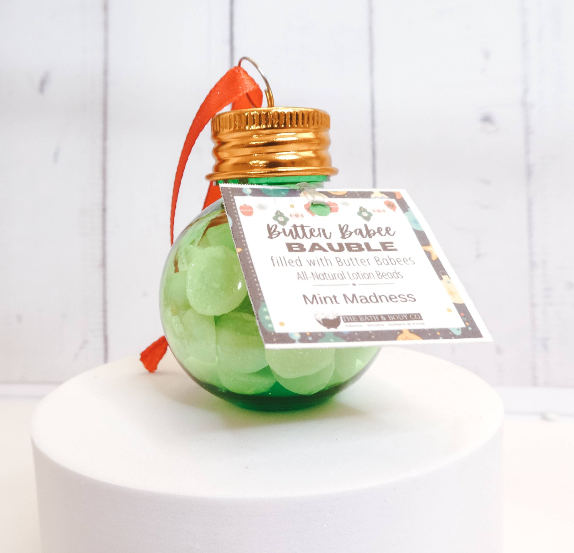 Indulge in the convenience of our Butter Babee Ornaments—elegantly designed baubles containing 25g of single-use lotion beads crafted from natural ingredients. Each bead dissolves effortlessly in your hands, releasing nourishing moisture that softens and hydrates skin. Choose from four captivating scents: Vanilla Dream, Citrus Breeze, Luscious Lavender, and Mint Madness. These thoughtfully packaged ornaments serve as ideal stocking stuffers, party favors, or self-care gifts that combine luxury with practicality.