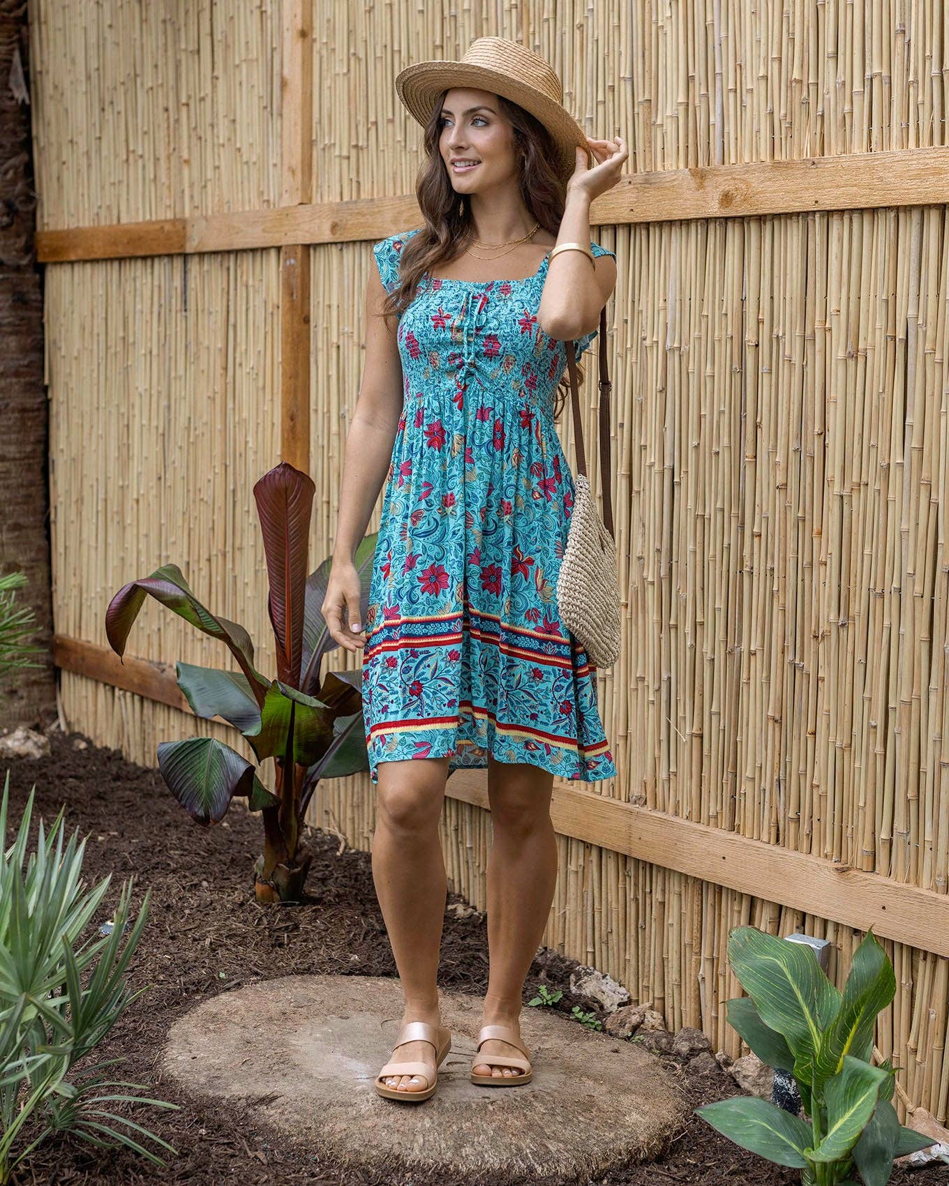 Border Print Smocked Dress in Blue Floral Print | Blue Floral Dress Flowy, feminine, fabulous! Introducing the Border Print Smocked Dress in an ultra-summery blue floral print. This beauty features a smocked bodice with a functional drawstring to create a flattering silhouette of your choice, while the elastic flutter sleeves give you the option to style it on- or off-shoulder. All in a beautiful summery floral design! Why you’ll love it: * Border print smocked dress in blue floral pattern * Smocked bust with functional drawstring for custom fit * Ultra-feminine flutter sleeves can be worn on- or off-shoulder * Pair this gorgeous summer dress with your favorite sandals and accessorize with jewelry for an effortlessly elevated look!