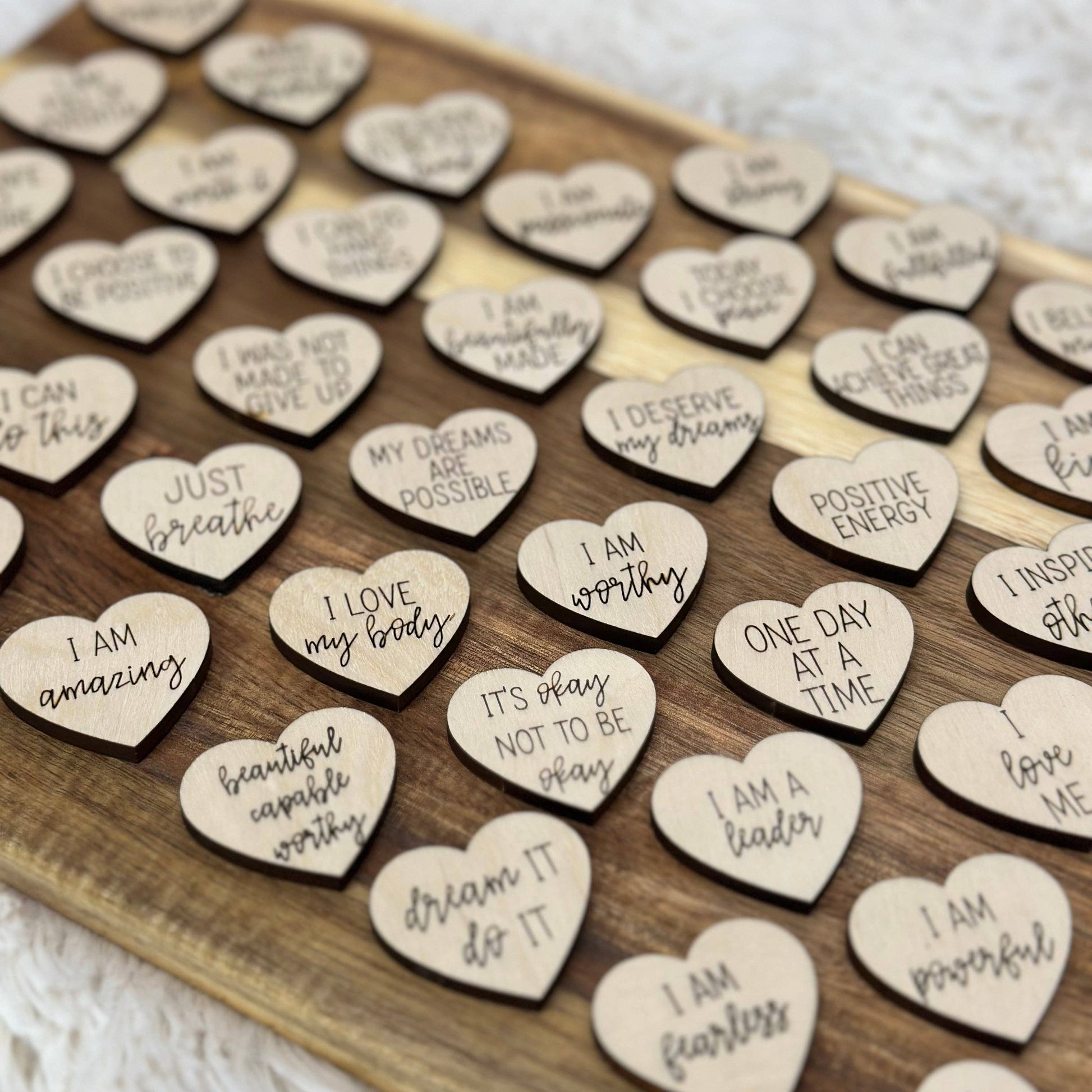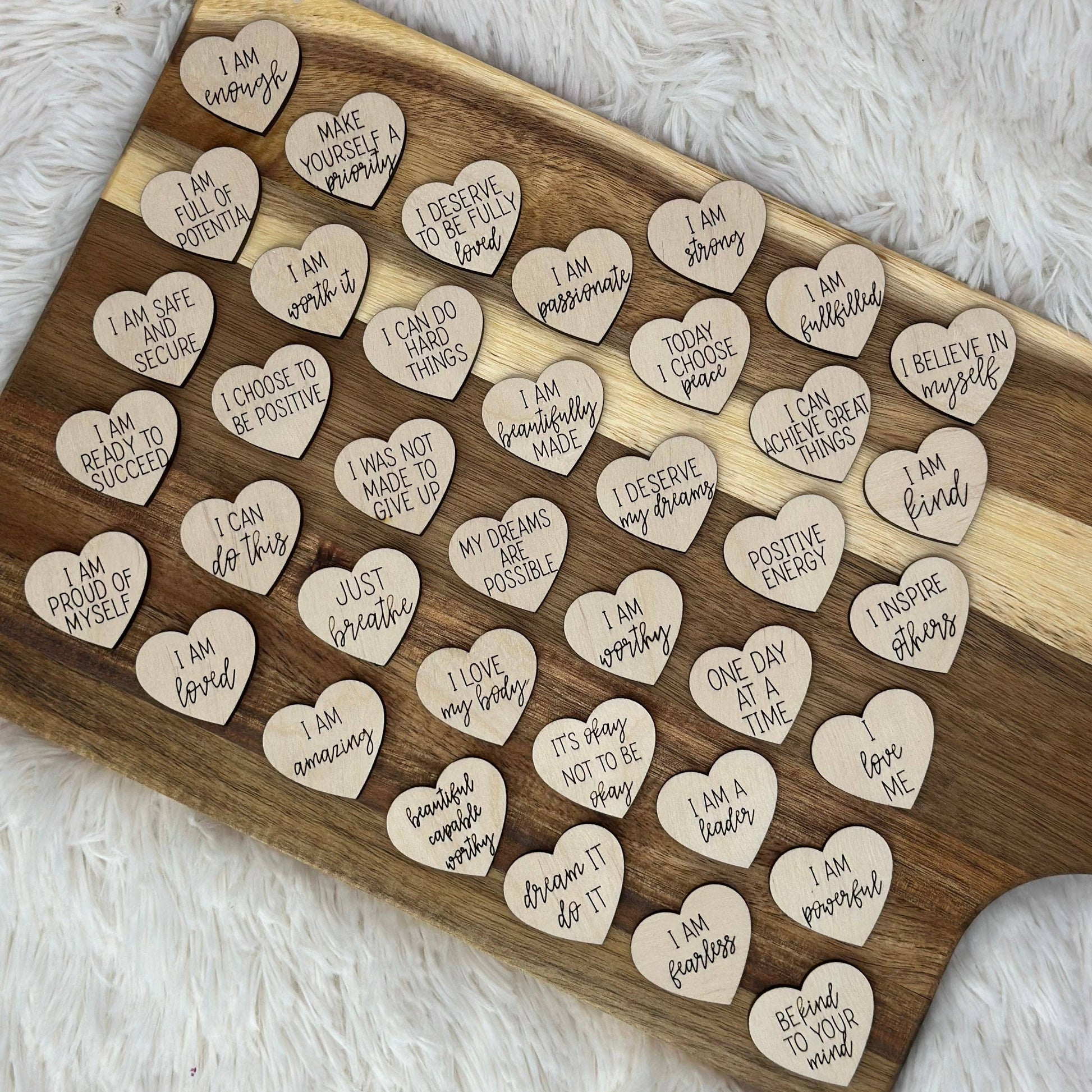 Unleash positivity every day with our Daily Affirmations - Activity Jar! This beautiful 14 oz glass jar, featuring a bamboo lid comes filled with 38 wooden hearts, each with a powerful affirmation. Use the two blank hearts to add your own personalized touch. Find joy and motivation with this one-of-a-kind jar.