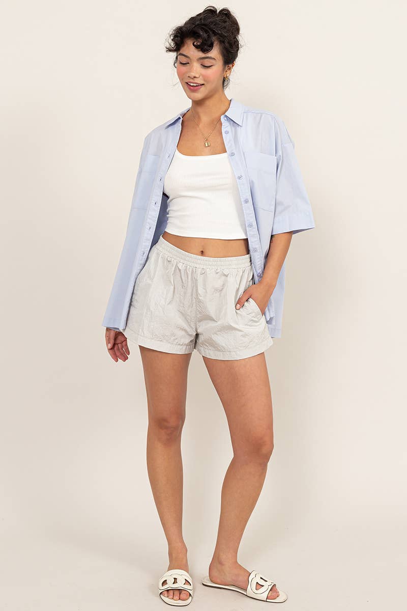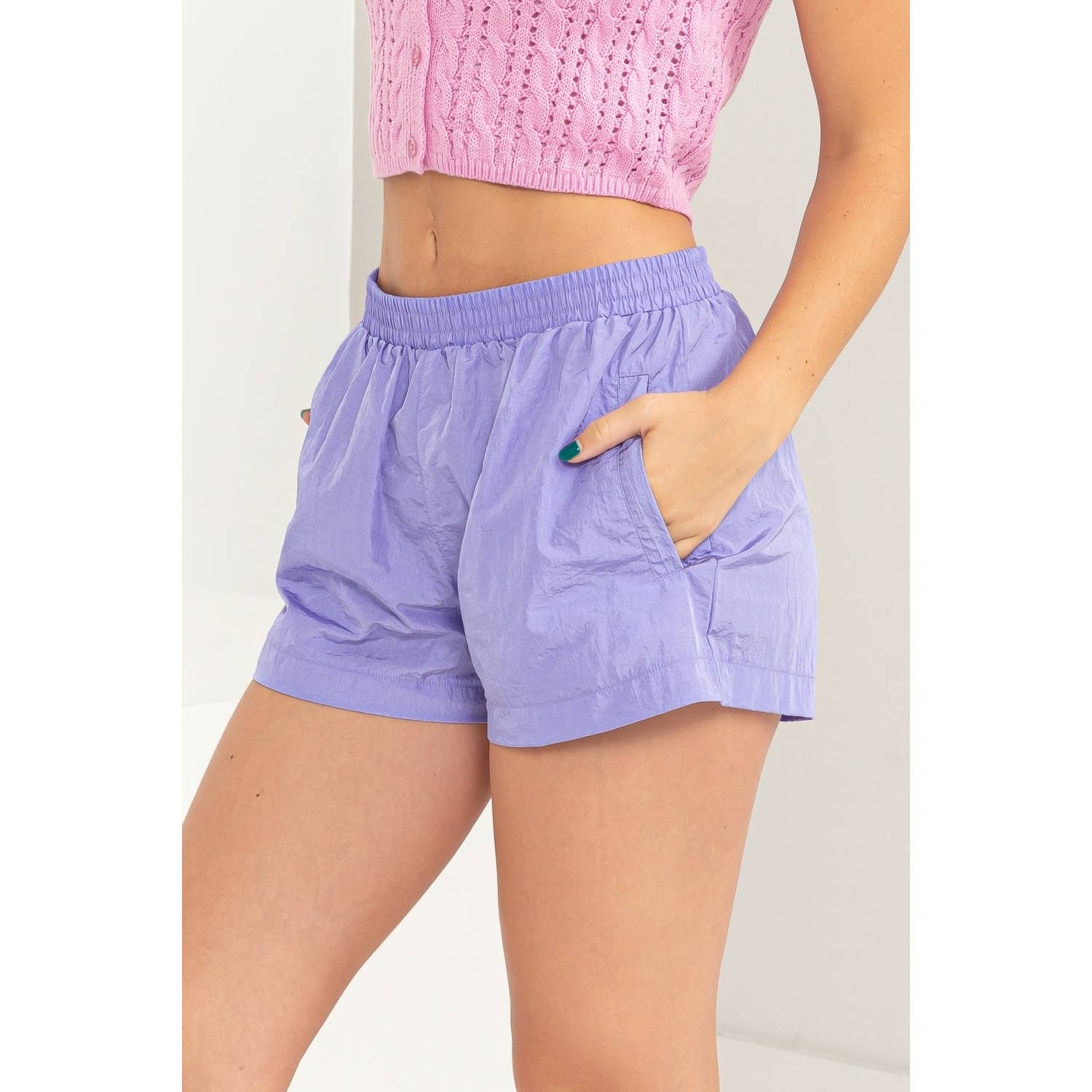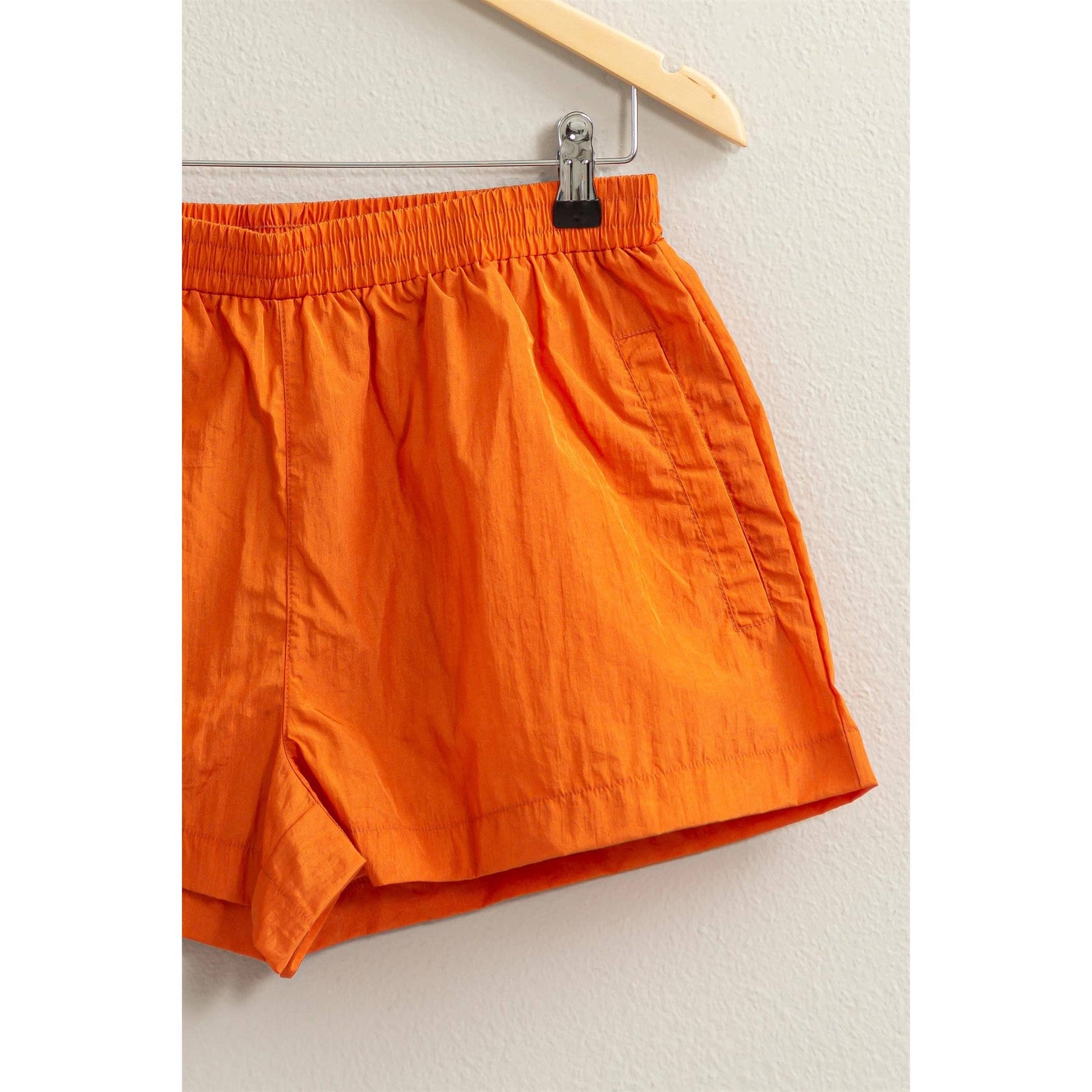 NIGHTS IN FEEL EXTRA COMFORTABLE WHEN YOU'RE WEARING THESE SHORTS. THESE ARE ADORNED WITH AN ELASTIC MID WAIST AND A BREEZY SILHOUETTE THAT ALLOWS YOU TO MOVE WITH EASE. SIDE POCKETS PROVIDE HANDS FREE CONVENIENCE. STYLE WITH A CROP TOP. 100% NYLON. DESIGNED IN THE USA
