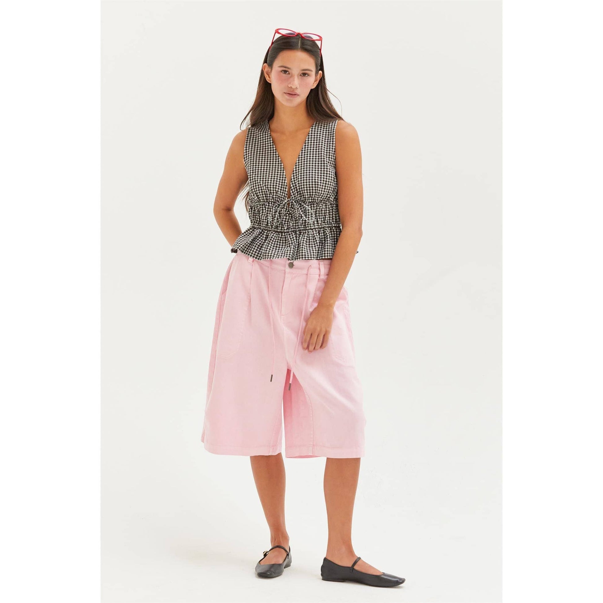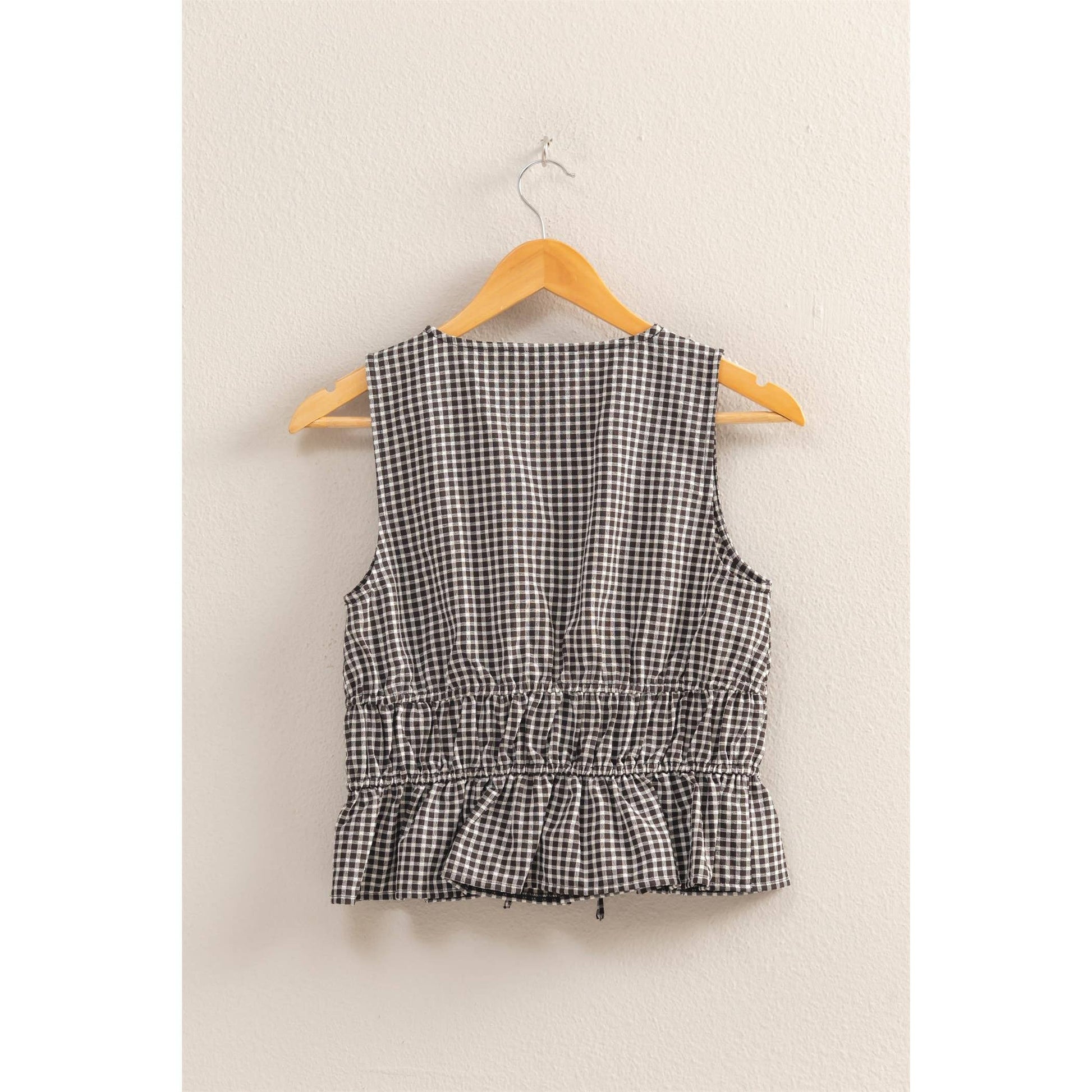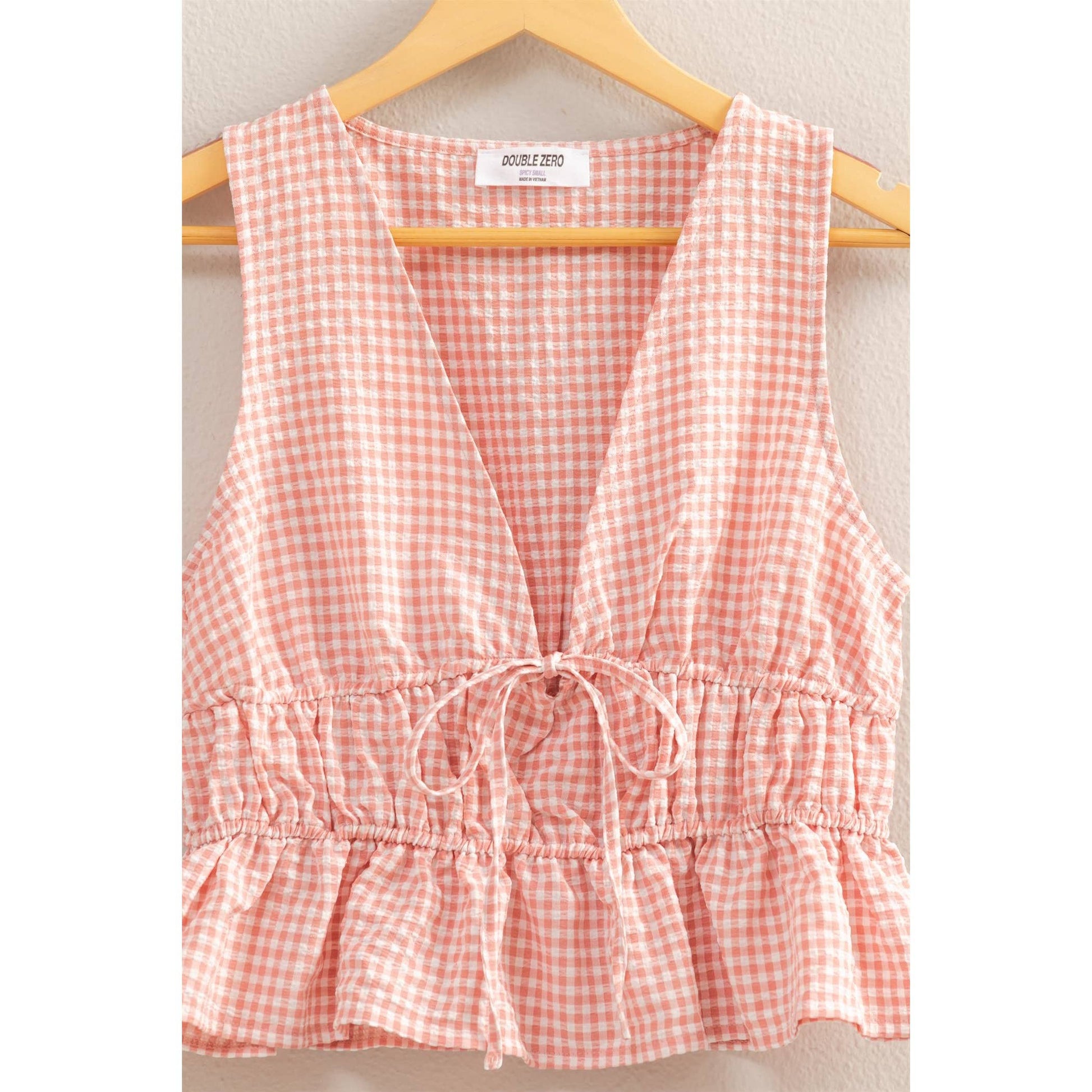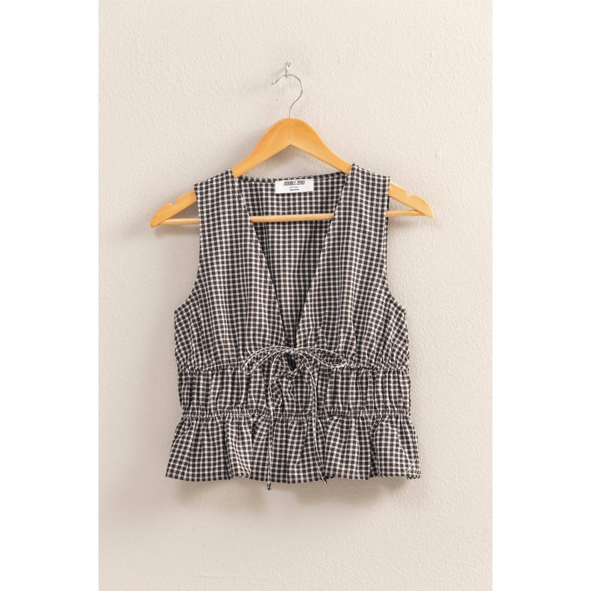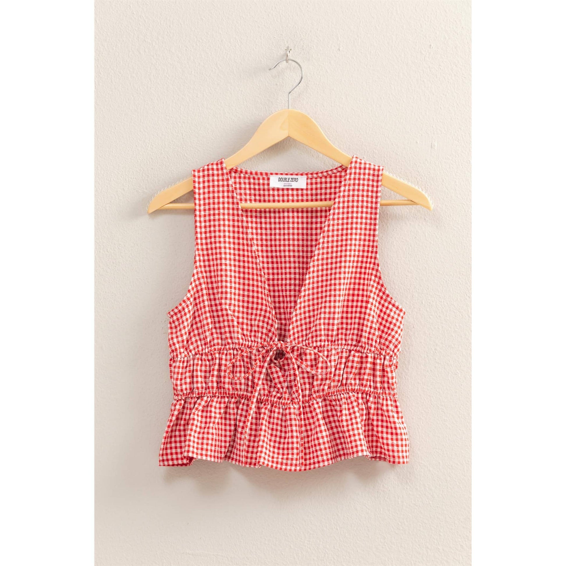 This Is Your Chance to Become Trendy. Covered In a Gingham Print, This Top Has a V-Neckline That Leads to Bow Detailing. The Sleeveless Bodice Has Tiered Detailing, Accentuated with Gathers to Give You a Perfect Fit. 97% Polyester 3% Spandex Model Is 5' 7" Tall, 32" Chest, 23" Waist, 34" Hips and Wearing a Size Small