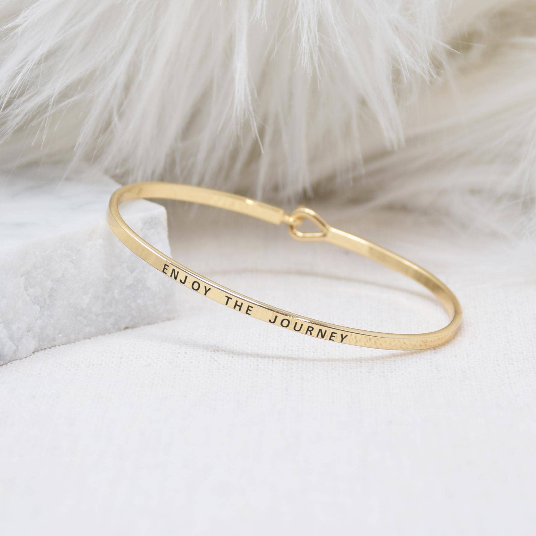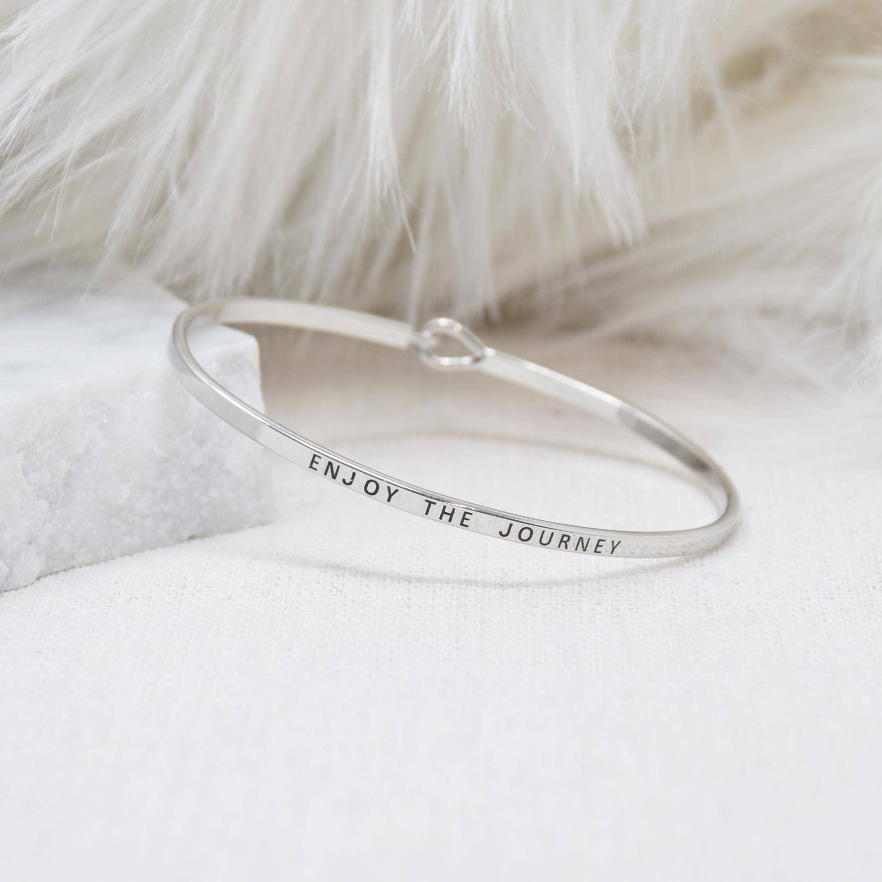 Dainty Inspired Message Engraved Simple Bangle. Inspirational bracelets that make for an excellent and meaningful gift for yourself, friends and loved ones. These are subtle, elegant, and beautiful alone or stacked creatively. We have an array of messages that you can mix and match to your heart's content. Wear it with purpose and care! Details: Premium high-quality band with hook closing Size: ranged from 1.5 mm thickness Diameter: 2.5 inches Circumference: fits up to 7 inches Wrist (please use a measuring tape to circle your wrist) Designed in the USA: Creative Messages This bracelet is made of and consists of a hook that is rhodium plated.