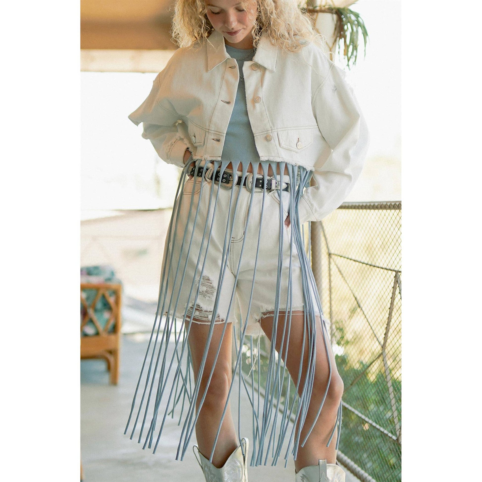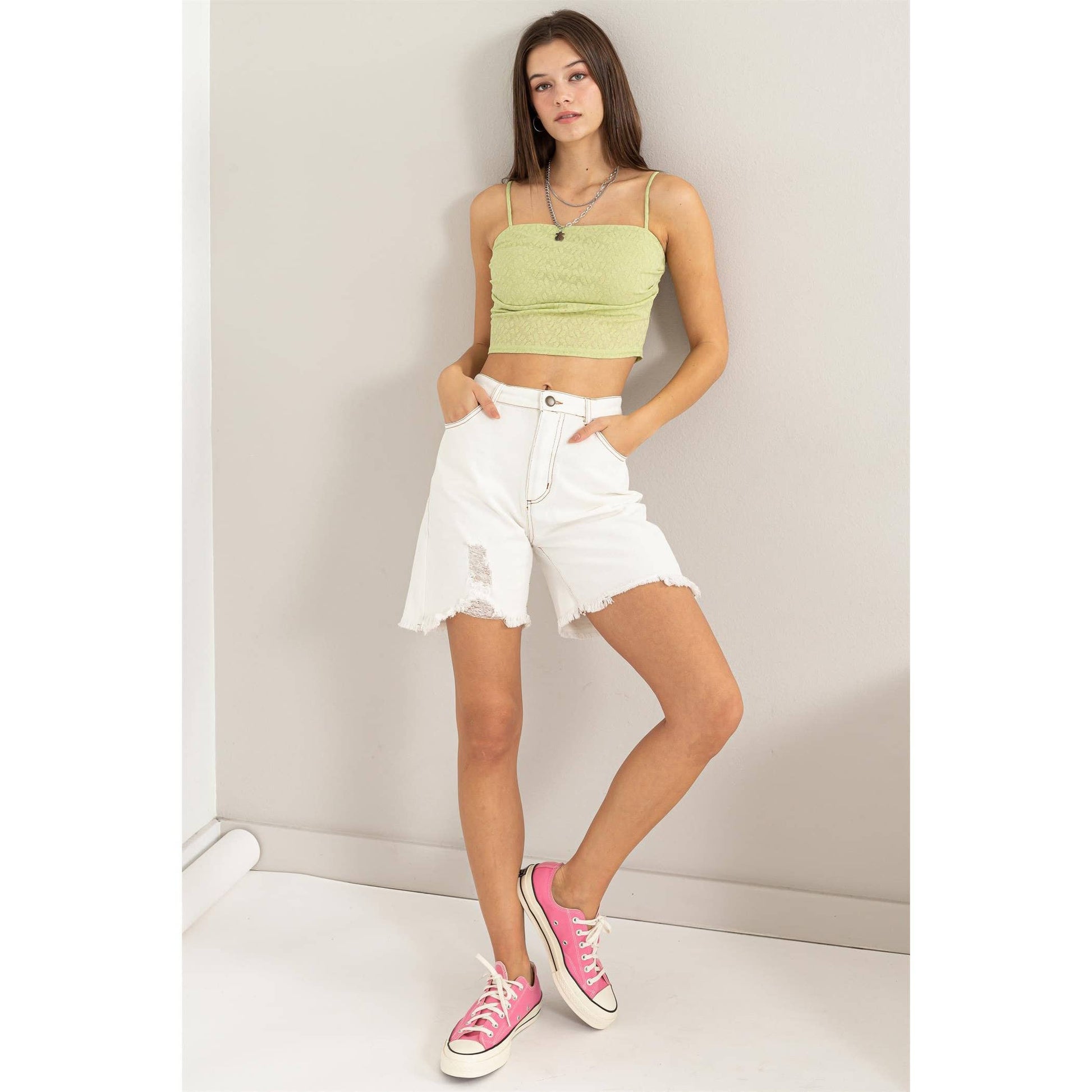 THESE DENIM SHORTS WILL BECOME YOUR NEW GO-TO BOTTOMS. THEY FEATURE A MID-RISE WAIST, BELT LOOPS AND FIVE-POCKET CUT. TRENDY DISTRESSING AND RAW HEMS CREATE AN EFFORTLESS LOOK. PAIR WITH A TANK TOP AND A PAIR OF YOUR FAVORITE SNEAKERS. IMPORTED. DESIGNED IN THE USA