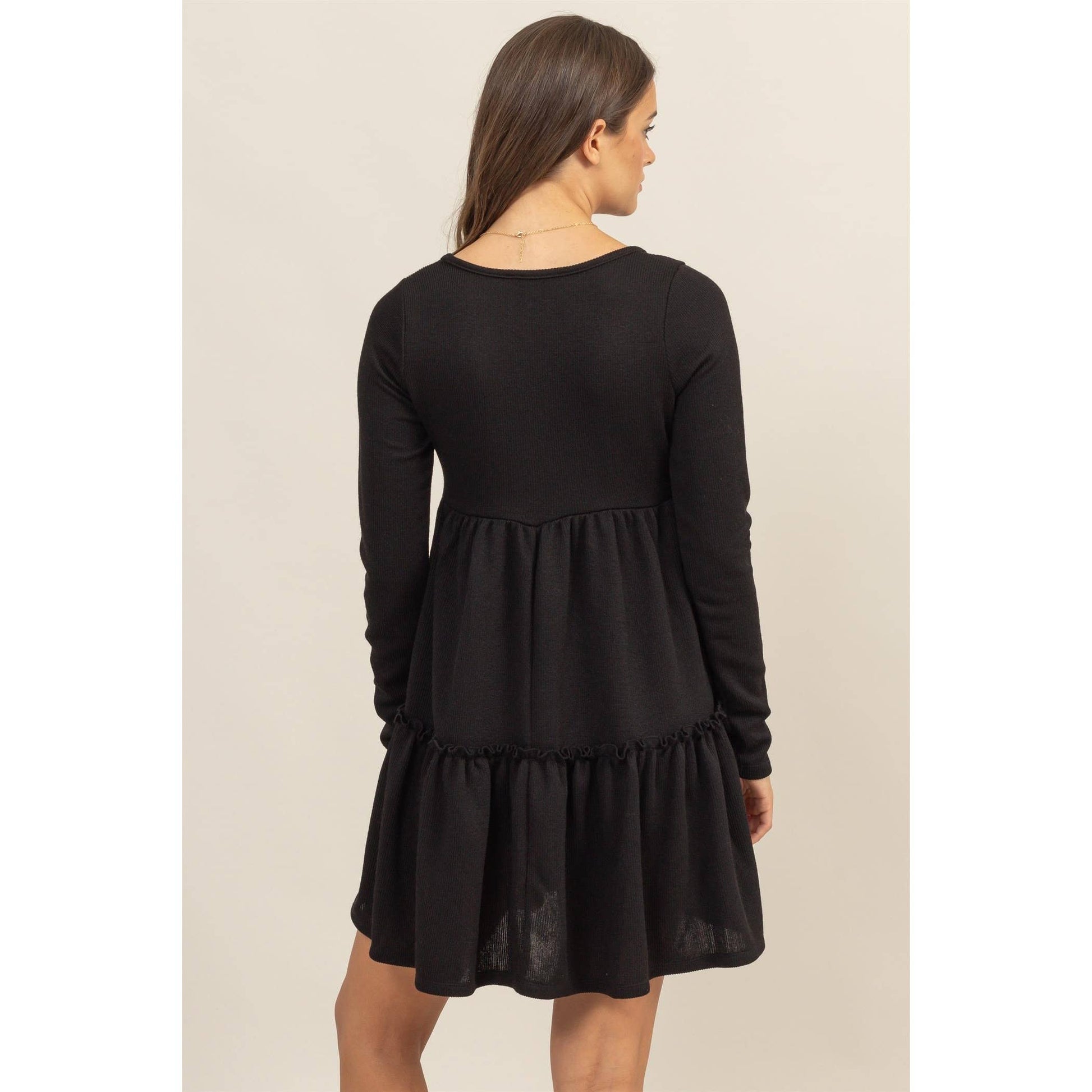 EMBRACE COMFORT AND STYLE WITH THIS BABYDOLL TIERED DRESS. FEATURING LONG SLEEVES AND A SCOOP NECKLINE, THIS DRESS OFFERS A RELAXED FIT AND A FLOWY, TIERED DESIGN THAT FLATTERS EVERY BODY TYPE. PERFECT FOR CASUAL OUTINGS OR DRESSING UP WITH ACCESSORIES FOR A NIGHT OUT. 96% POLYESTER 4% SPANDEX MODEL IS 5' 7" TALL, 32" CHEST, 25" WAIST AND 35" HIPS AND WEARING A SIZE SMALL IMPORTED. DESIGNED IN THE USA