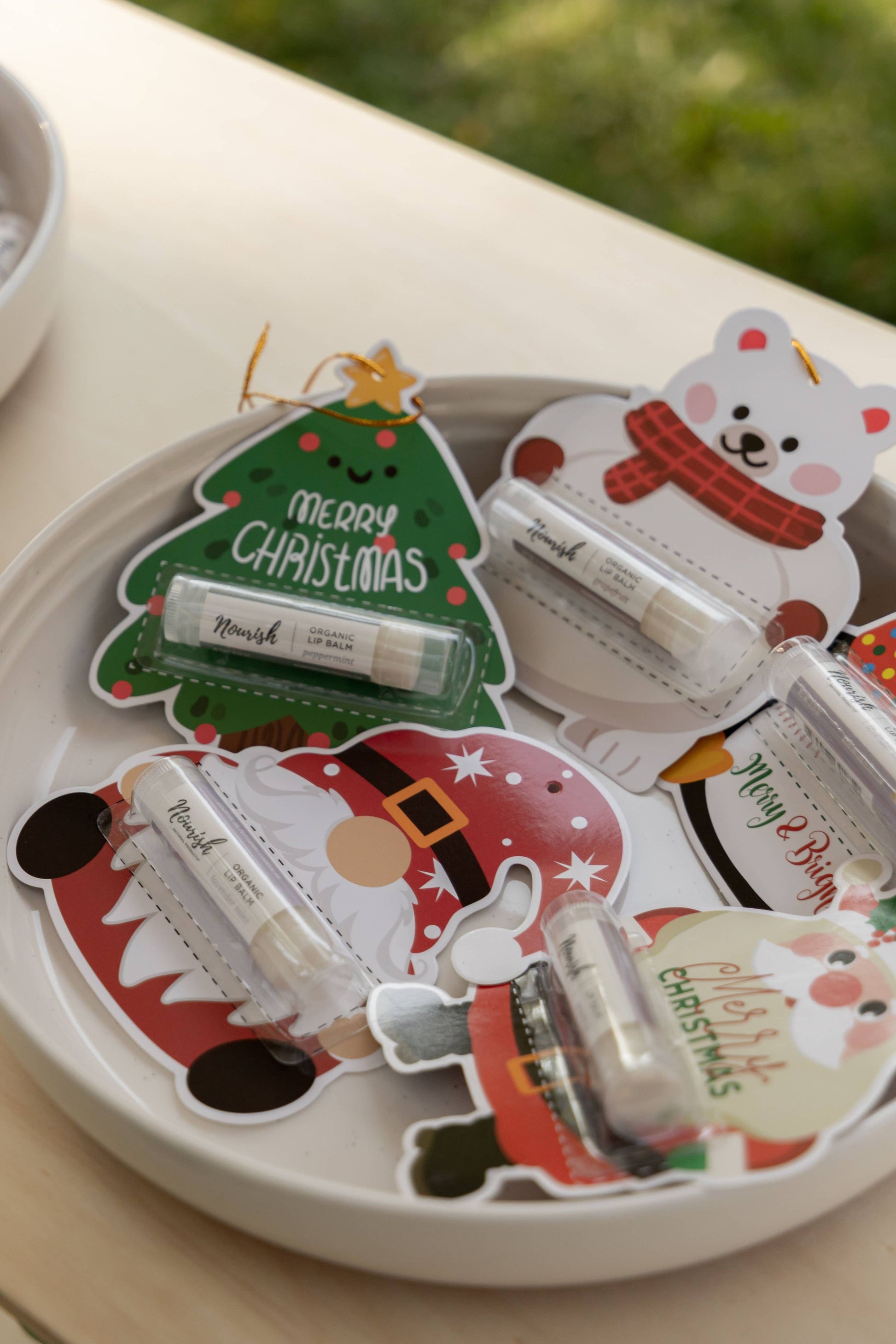 Spread holiday cheer and soft, kissable lips with our "Kissmas Ornaments!" Each ornament features a festive, double-sided Christmas design—Santa, snowmen, reindeer, gnomes, and more. Attached to each ornament is one of our beloved Nourish Organic Lip Balms, ready to bring a little extra joy (and moisture!) to the season. Hang it on the tree, tuck it into a stocking, or tie it onto a gift for the perfect touch of natural holiday magic. ✨ Made with 100% natural ingredients 🎁 Includes one full-size Nourish Lip Balm 🌿
