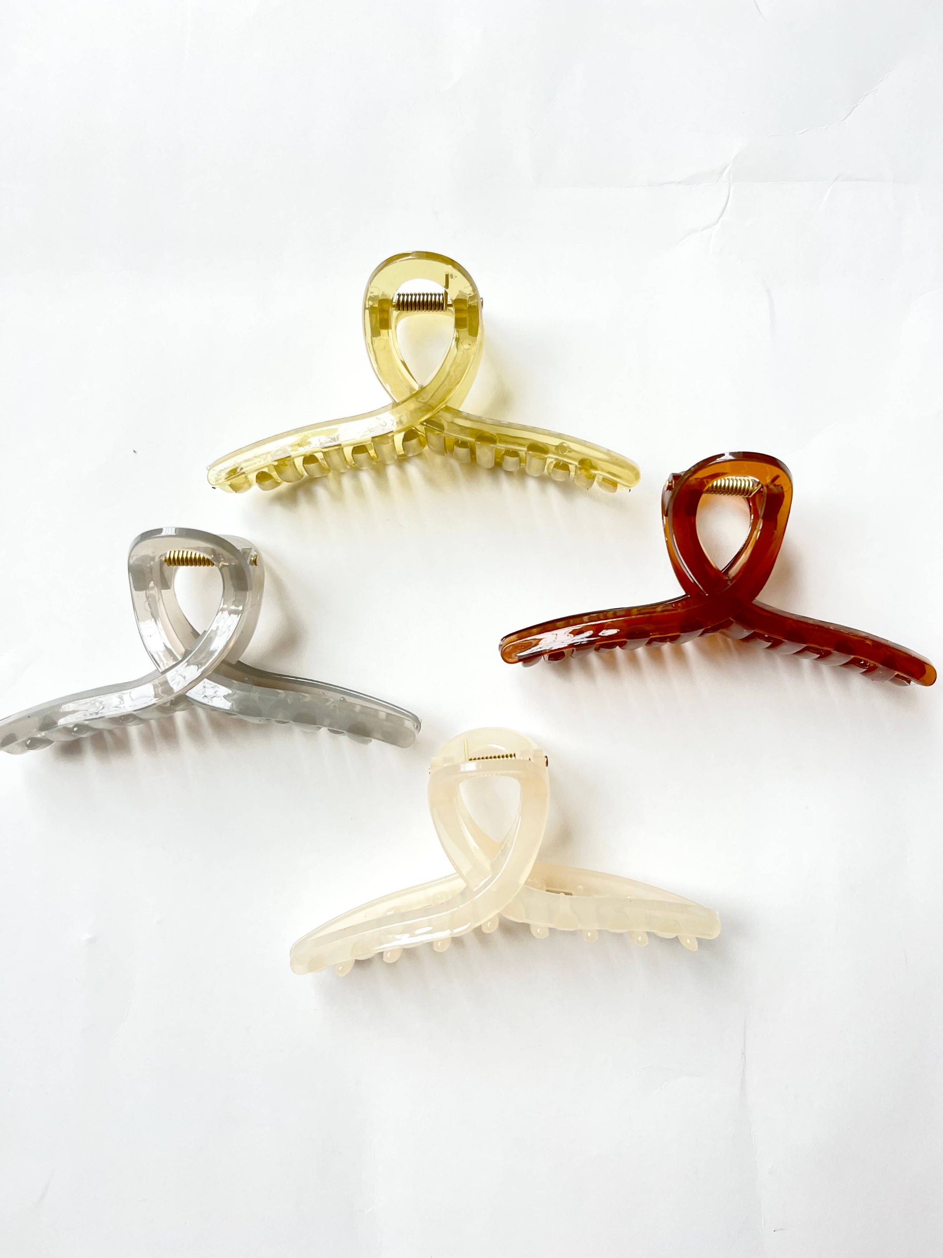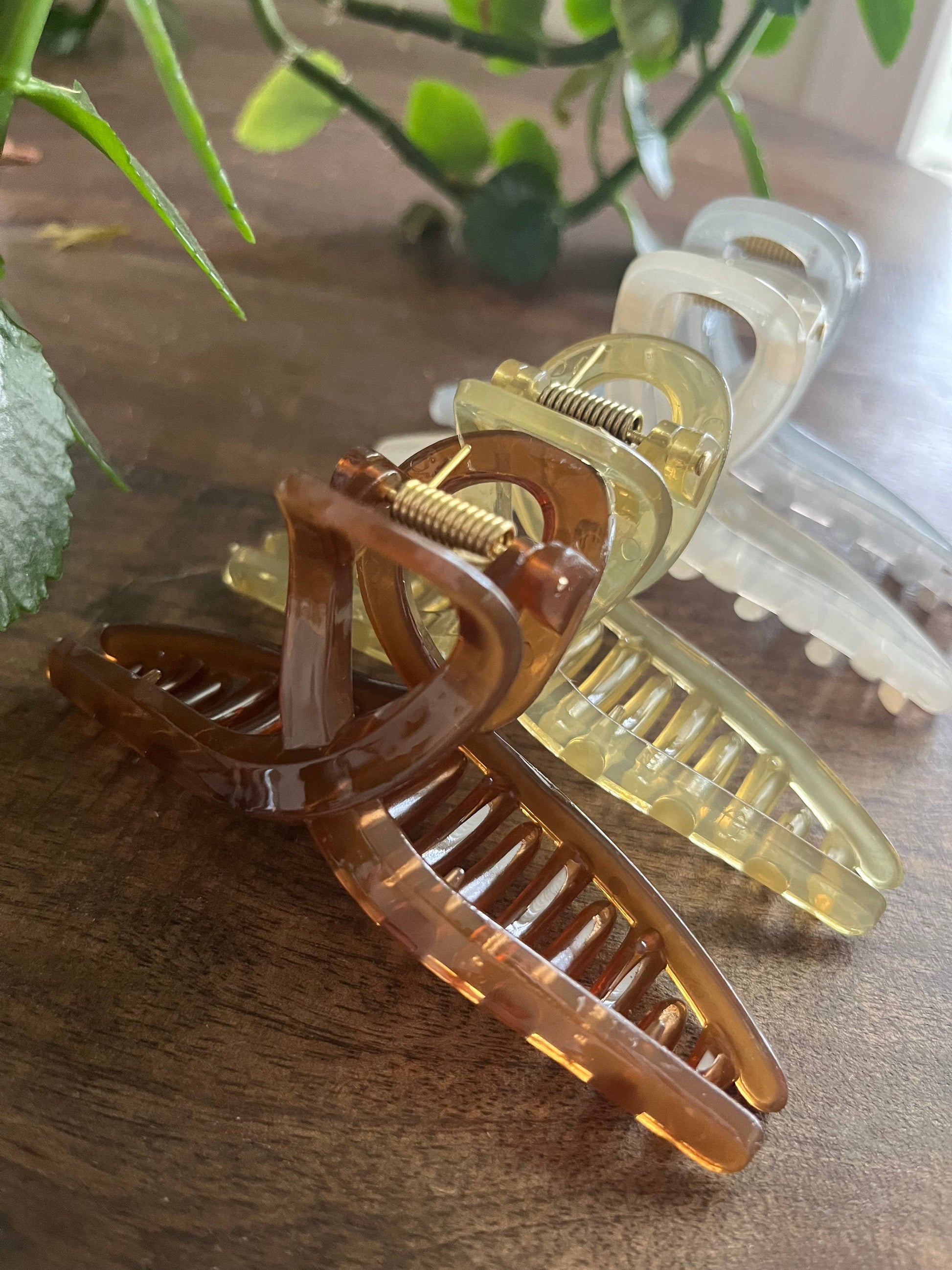 Individual translucent loop hair claw clips - (2) Gold Coast (golden brown) - (2) Smoke (gray) - (2) Rainwater (clear) - (2) Rainforest (green) Size: Large Closure: claw closure Measurements: 4.3" length Keyword: Salon, Spa, Boutique, Gift, Fall, Football, Gift Shop, Gymnastics, Dance, Florist, Halloween, Christmas, Thanksgiving, Autumn, Pumpkins, Pumpkin Spice, Accessories, Gifts for Her, Makeup, Skincare, Florist, Bridal, Stocking Stuffers