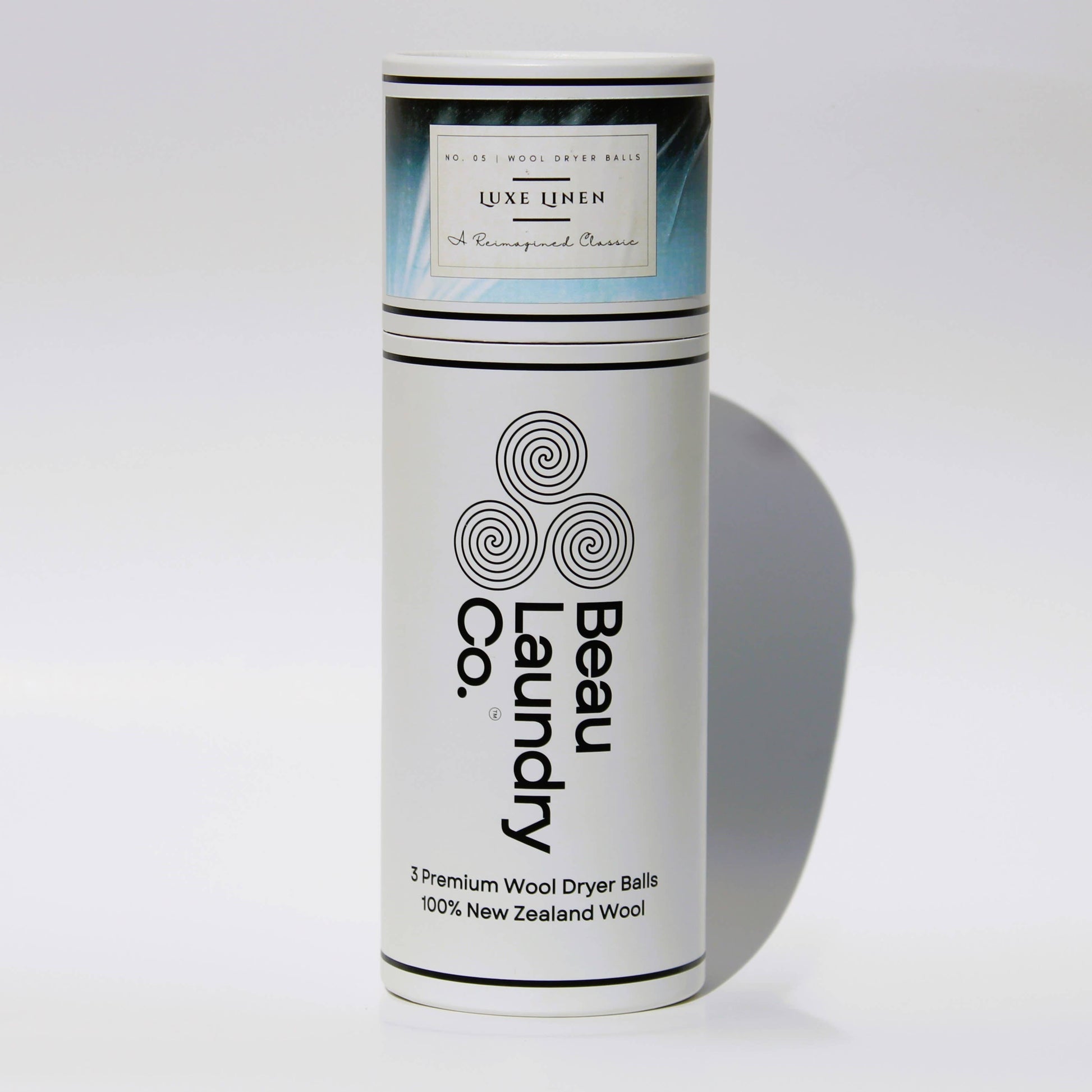 It smells like: crisp, high thread, luxury sheets. Scent notes: aquiesse-esk warm linen, herbal tea, and smooth sandalwood. What you get: 3 premium Beau Laundry Co. wool dryer balls that last 1000+ loads.