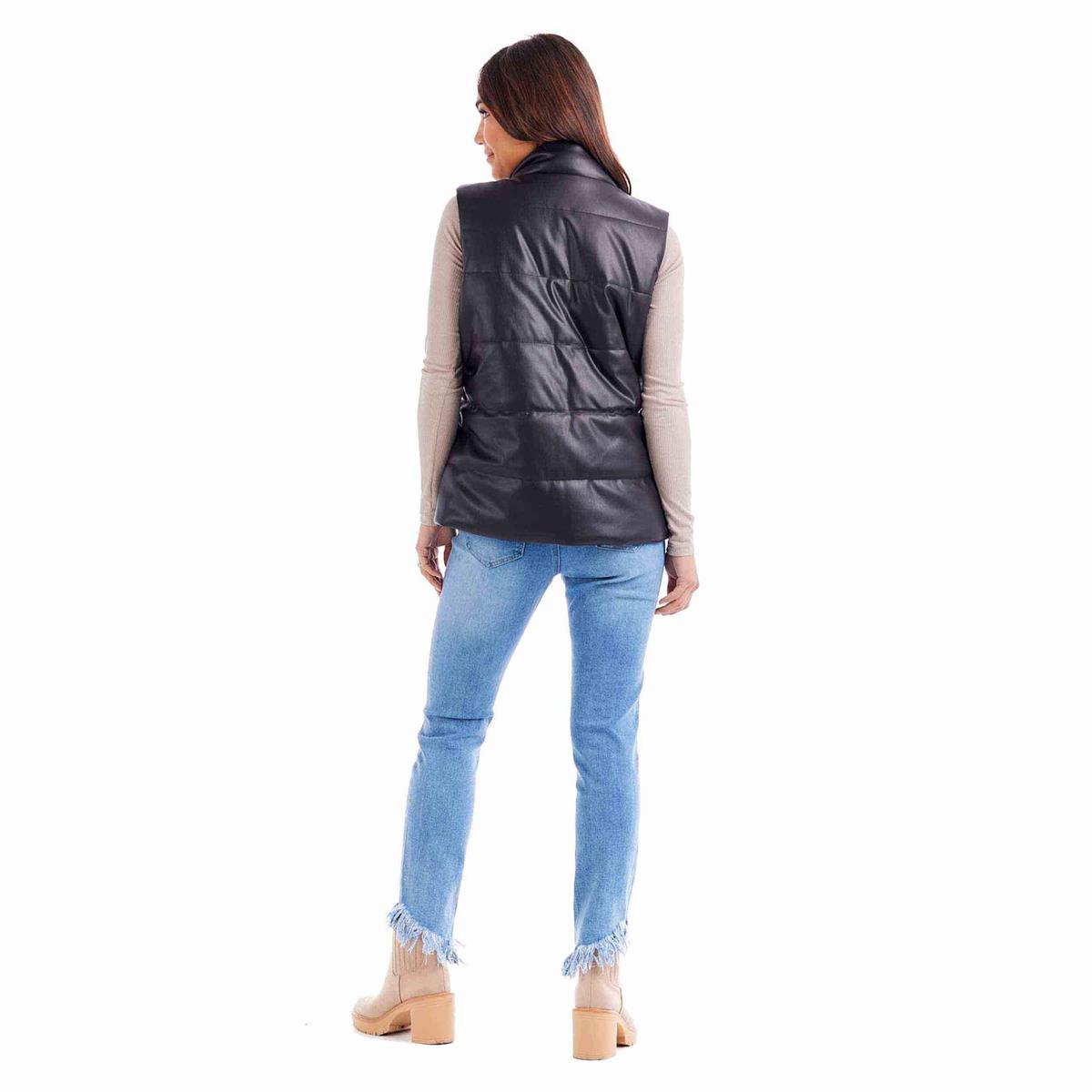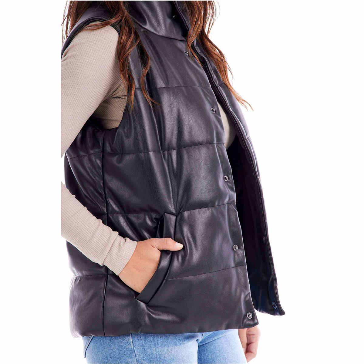 Lined faux leather puffer vest features front pockets and coated snaps. Measures approximately 24 1/2" from shoulder to hem on size small.