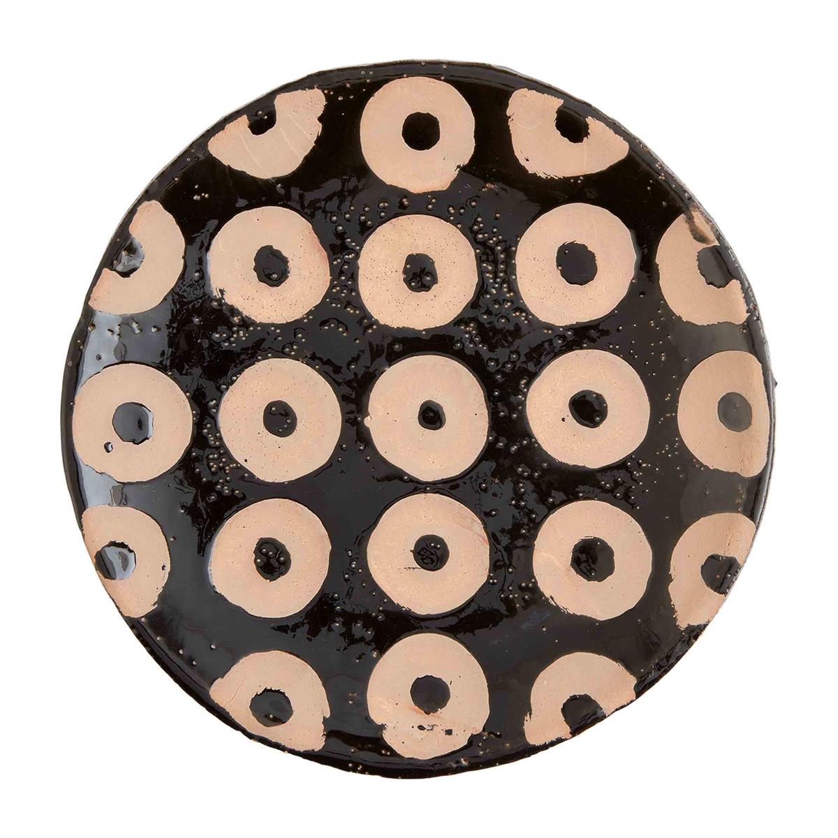 Spruce up your decor with our Black Circle Platter. The glazed terracotta round platter makes a show-stopping piece for your home. The platter features a black background with tan circles throughout. The platter is for decorative purposes only and is not food safe. The platter should be hand washed only.