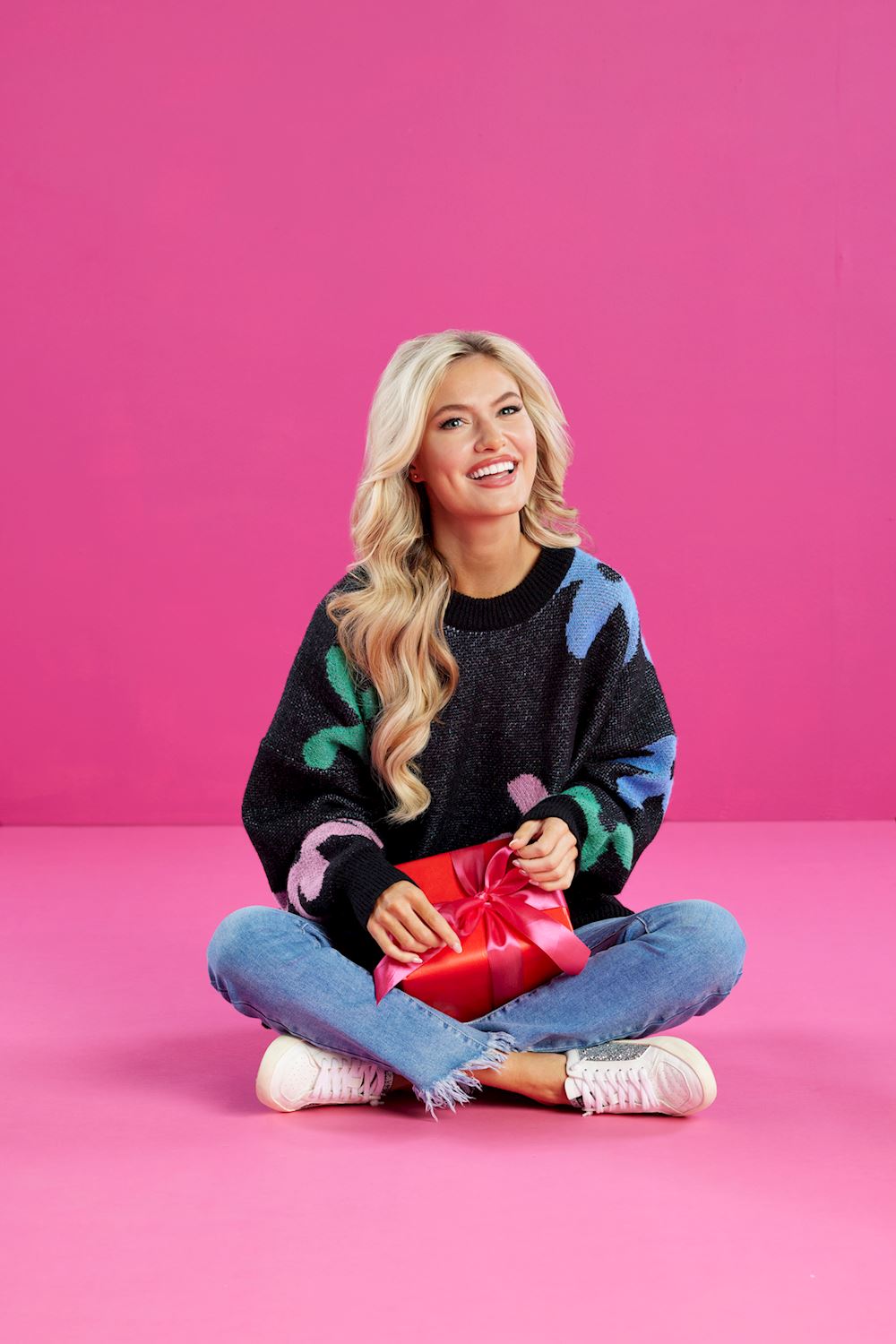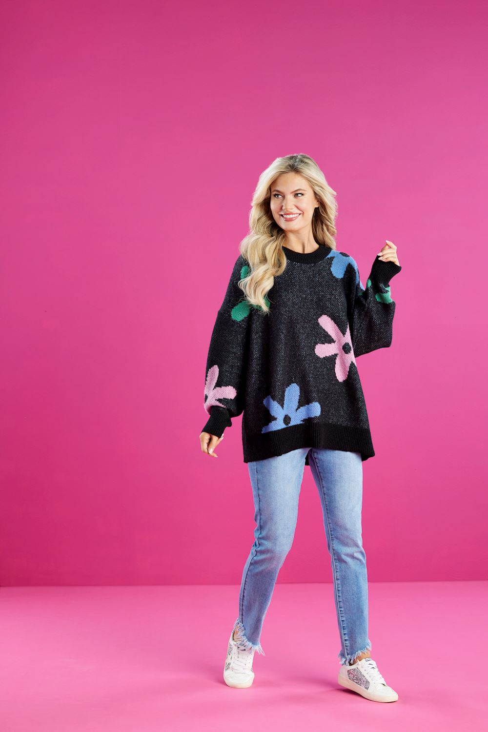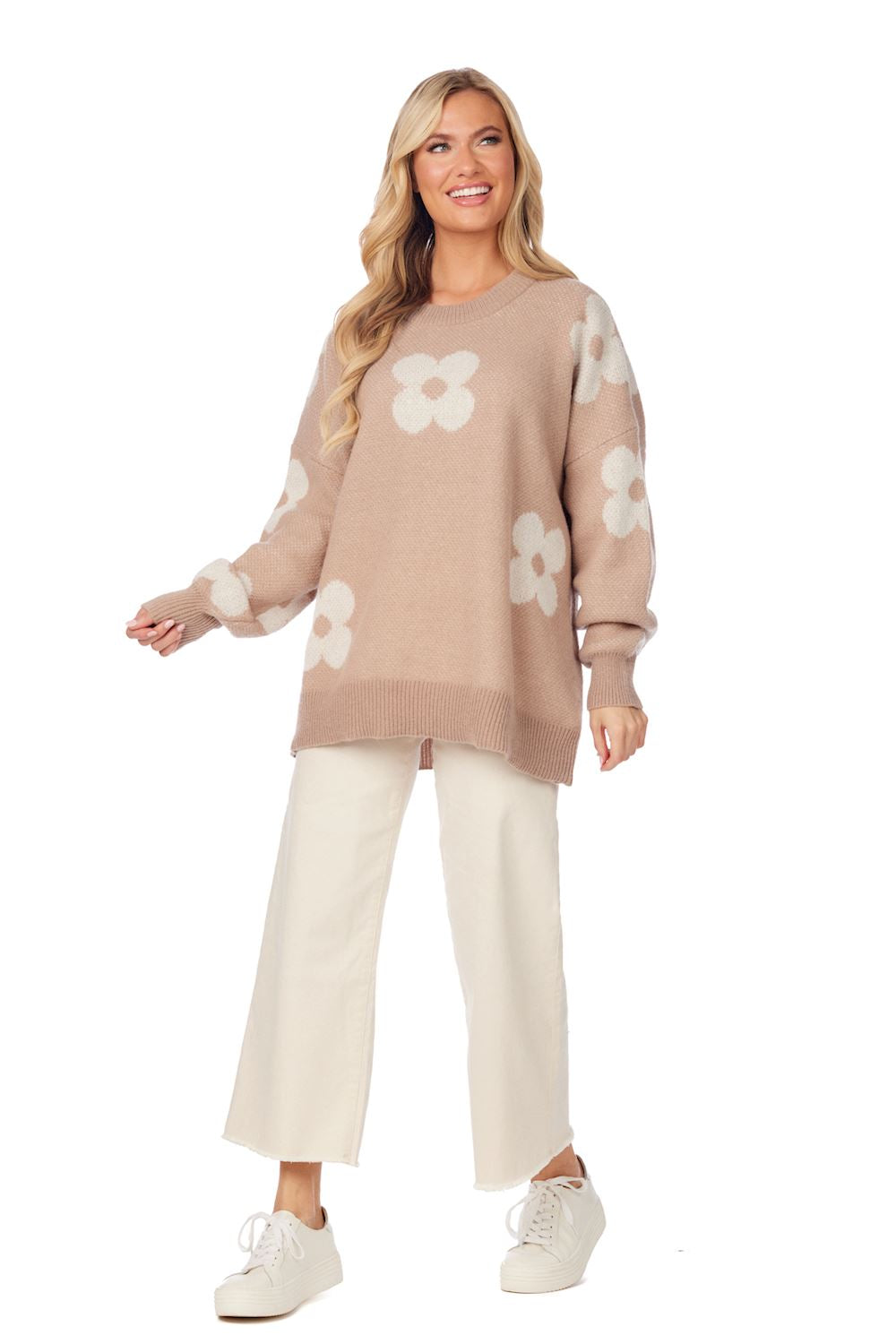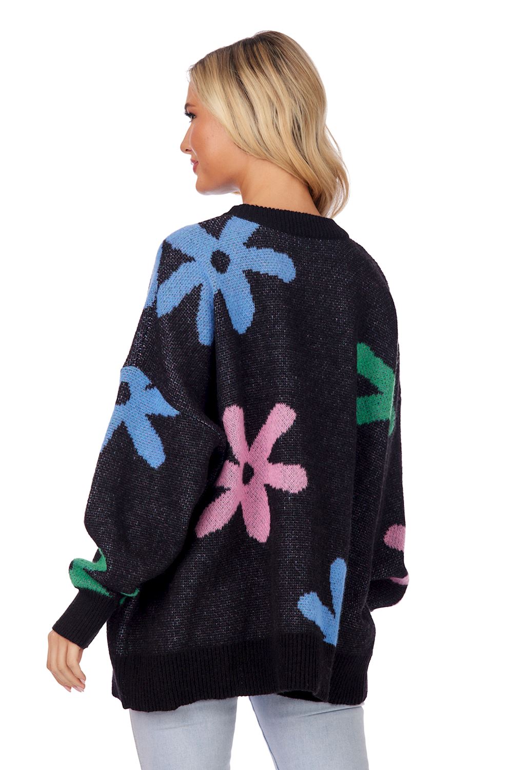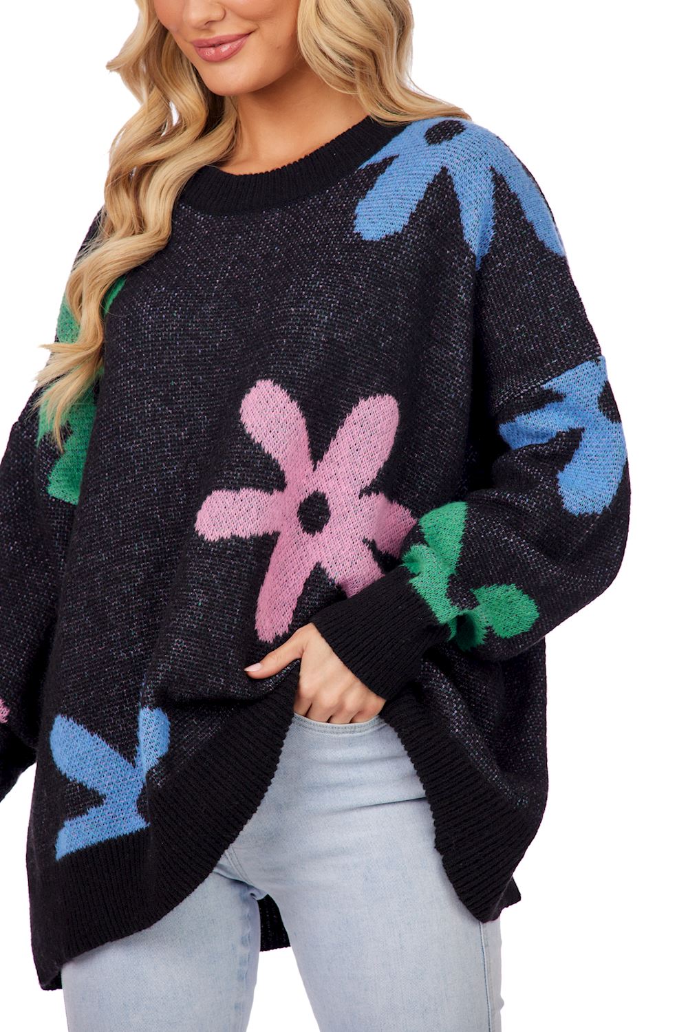 Lightweight sweater featured oversized jacquard floral pattern with ribbed binding. One size fits most. Measures approximately 27" from shoulder to hem.