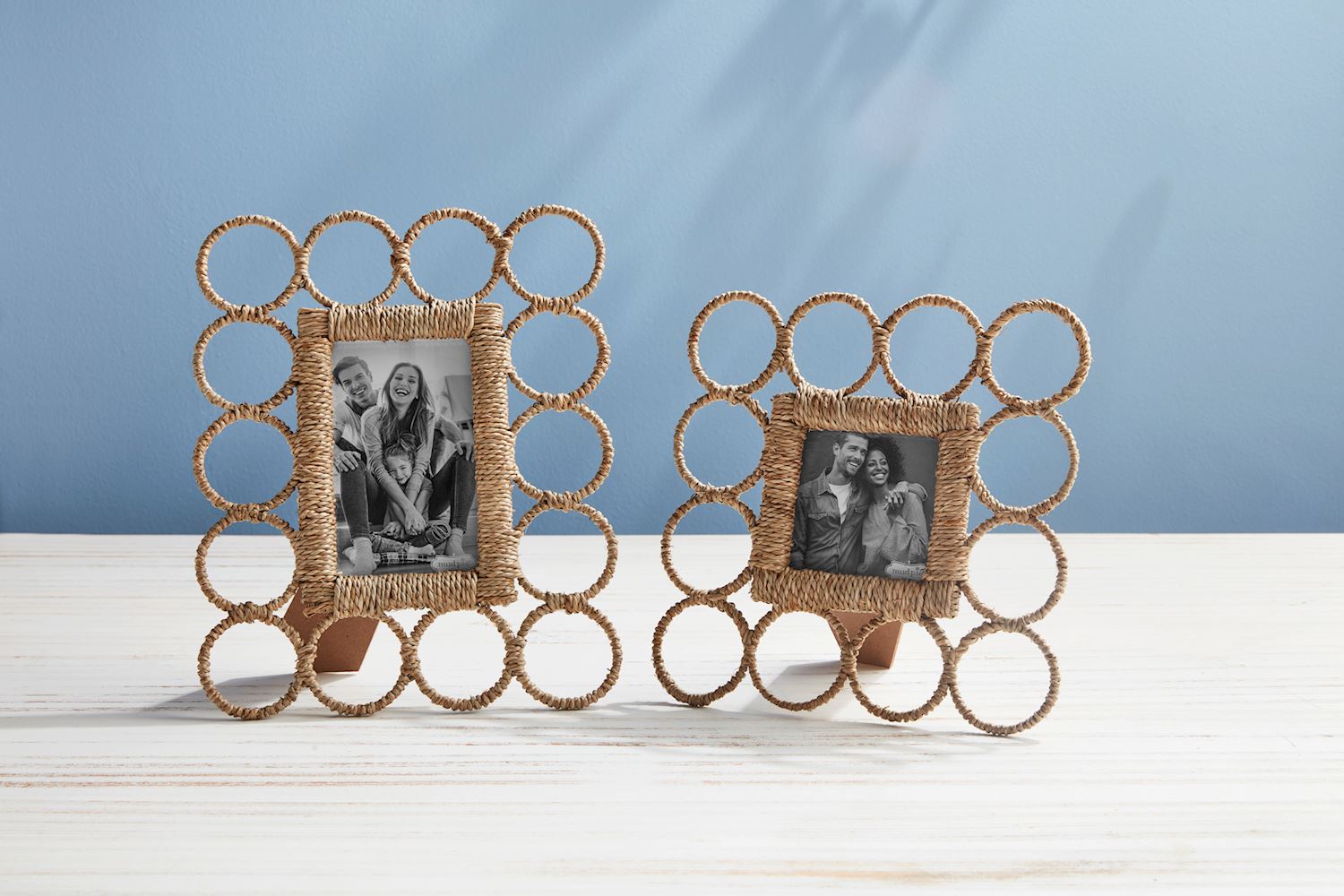 The Seagrass Wrapped Metal Ring Frame is a beautifully crafted piece that combines natural elements with modern design. This unique frame is meticulously wrapped in seagrass, offering a rustic yet elegant touch to any space. It is designed to hold a 4" x 4" photo, making it perfect for showcasing your cherished memories. The frame features an easel back, allowing it to stand securely on any tabletop or shelf. Measuring 8 1/4" x 8 1/4", it is an ideal size for adding a personal touch to your home or office decor. The natural texture of the seagrass complements a variety of interior styles, from coastal to contemporary, making it a versatile addition to your collection. Whether you're displaying a family photo, a snapshot from a special occasion, or a piece of art, this frame will enhance the beauty of your image while adding a touch of nature-inspired charm to your surroundings.