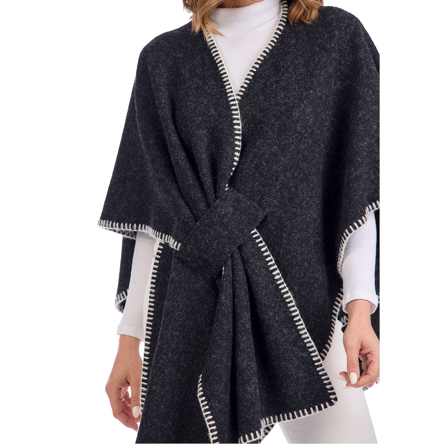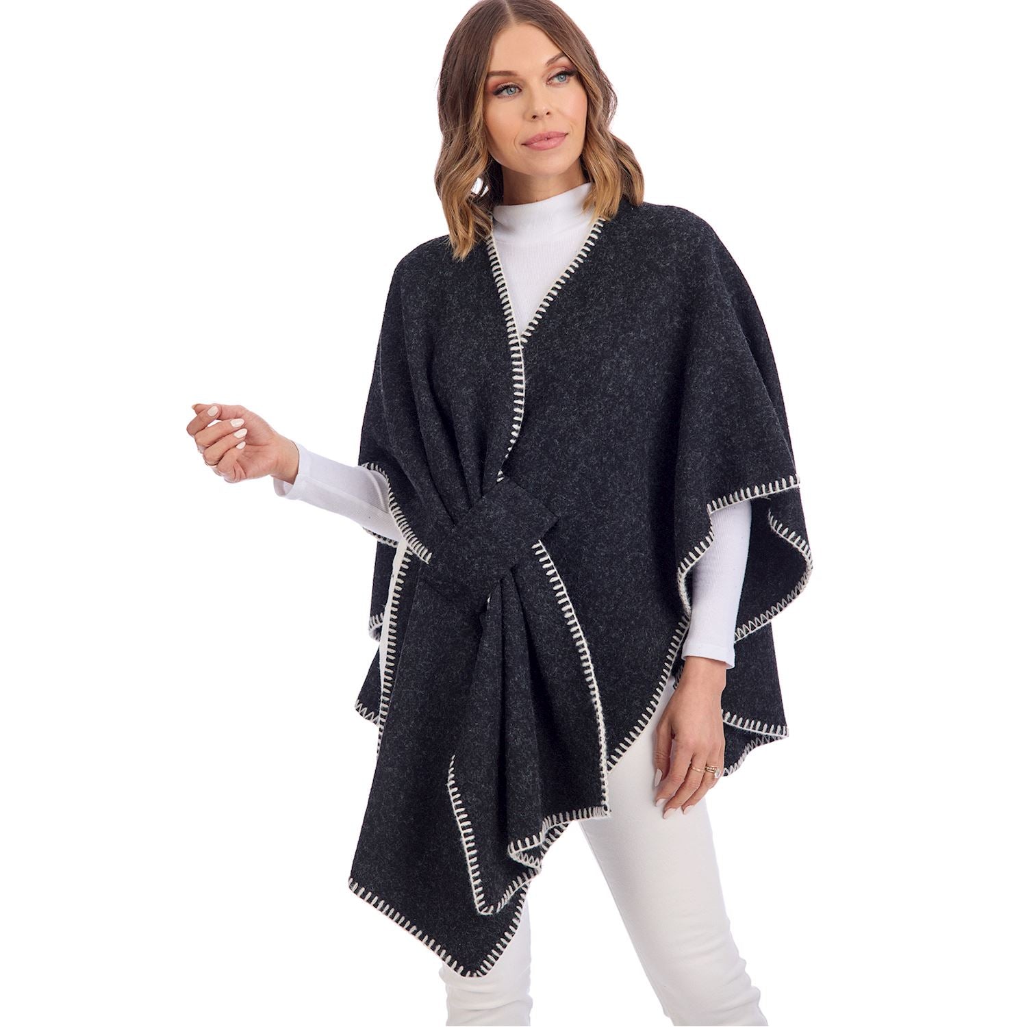 The Hayword Blanket Poncho combines style and comfort with its heathered polyester felt fabric, offering a cozy and chic look. The contrast blanket stitching adds a touch of elegance, while the pull-through loop front closure ensures a secure fit. Designed to accommodate a wide range of body types, this one-size-fits-most poncho measures approximately 31 1/2" from shoulder to hem, providing ample coverage and warmth. Crafted from a blend of 68% polyester, 22% acrylic, 6% nylon, 3% wool, and 1% other fiber, it offers durability and softness. Perfect for layering over your favorite outfits, this versatile poncho is ideal for both casual outings and more formal occasions, making it a must-have addition to your wardrobe.