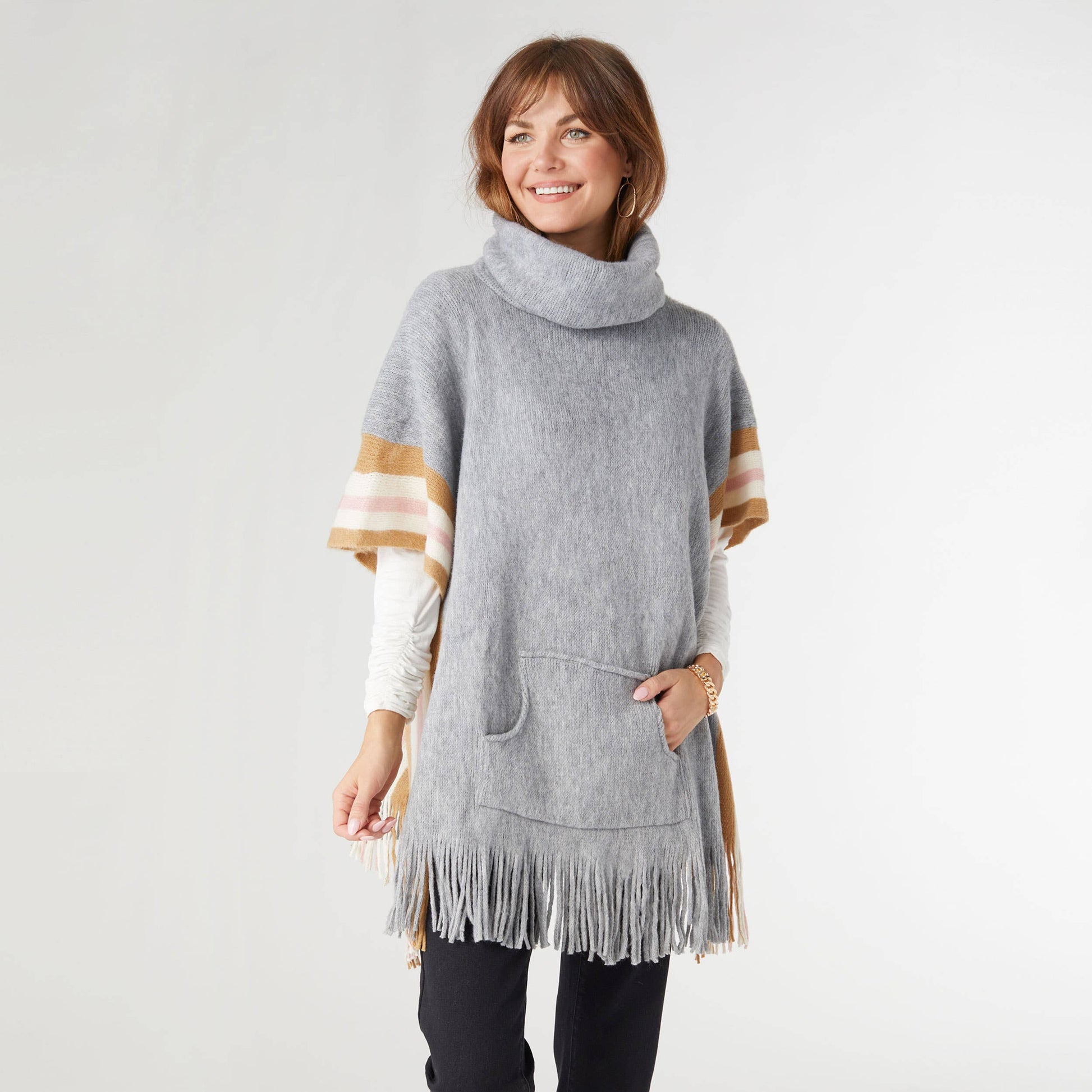 Elevate your winter wardrobe with the Myrna Turtleneck Poncho! With its on-trend border stripes, cozy turtleneck, and handy front pouch, this poncho is a must-have for fashion-forward individuals who love a good blend of style and functionality.