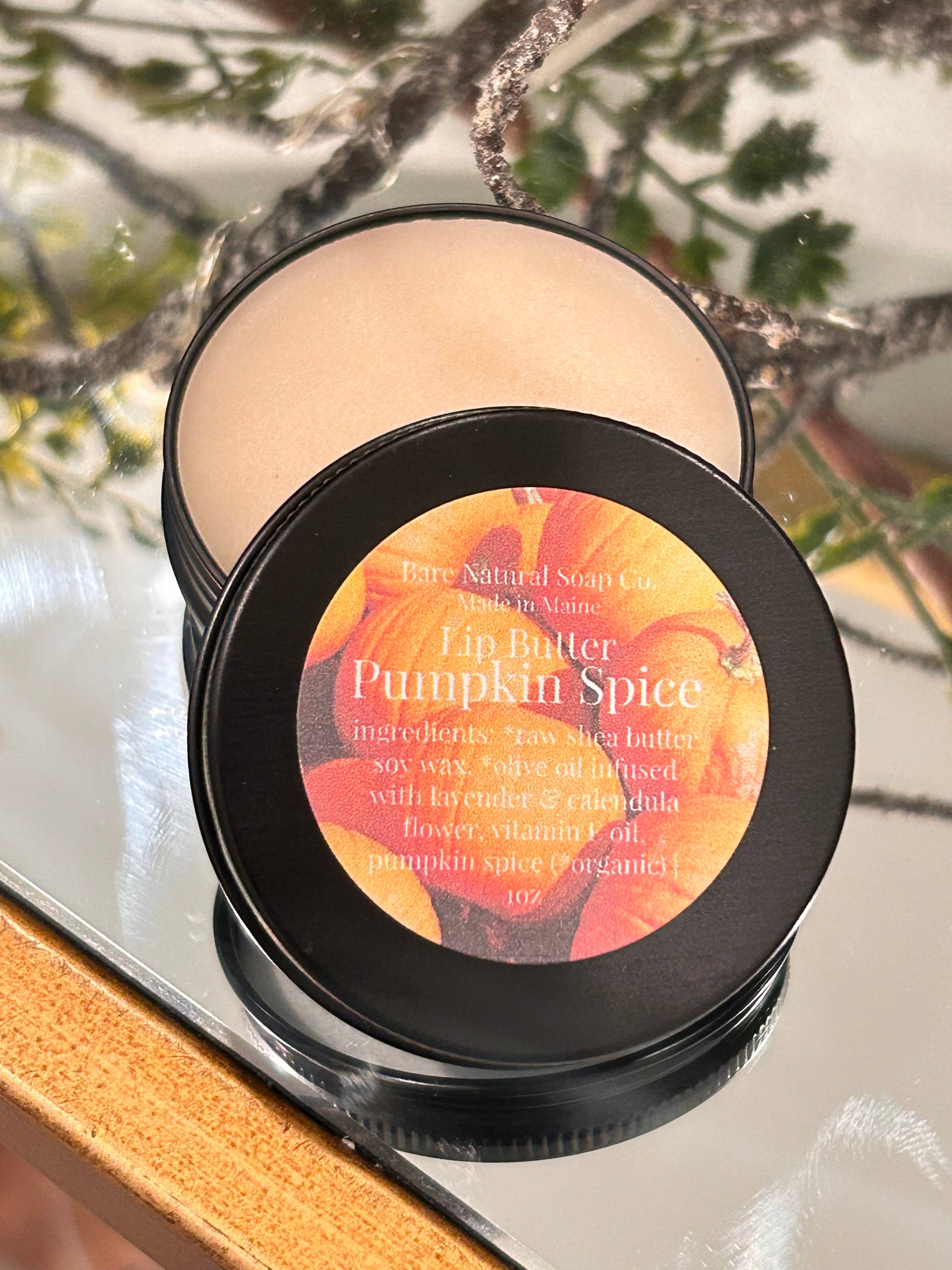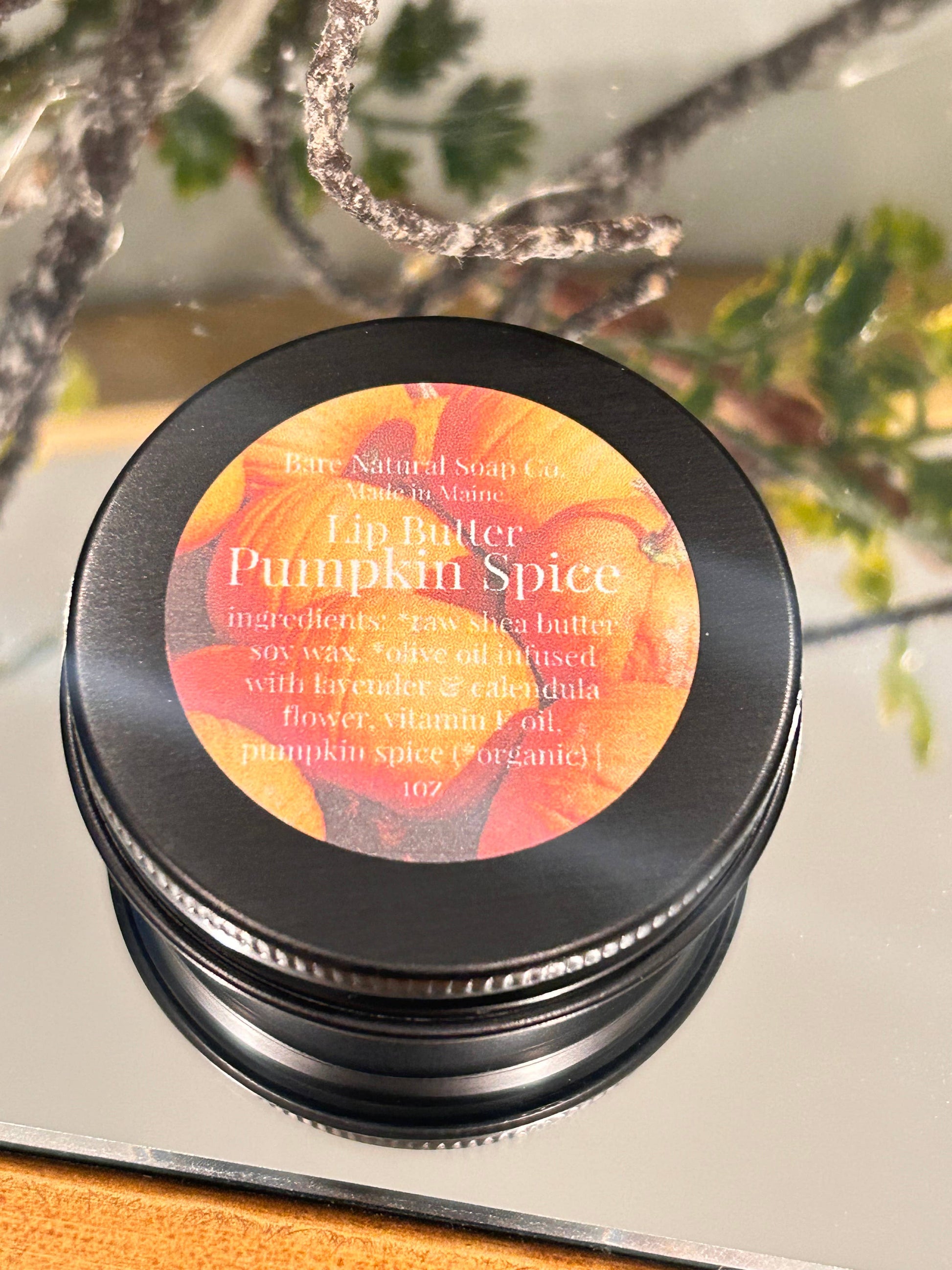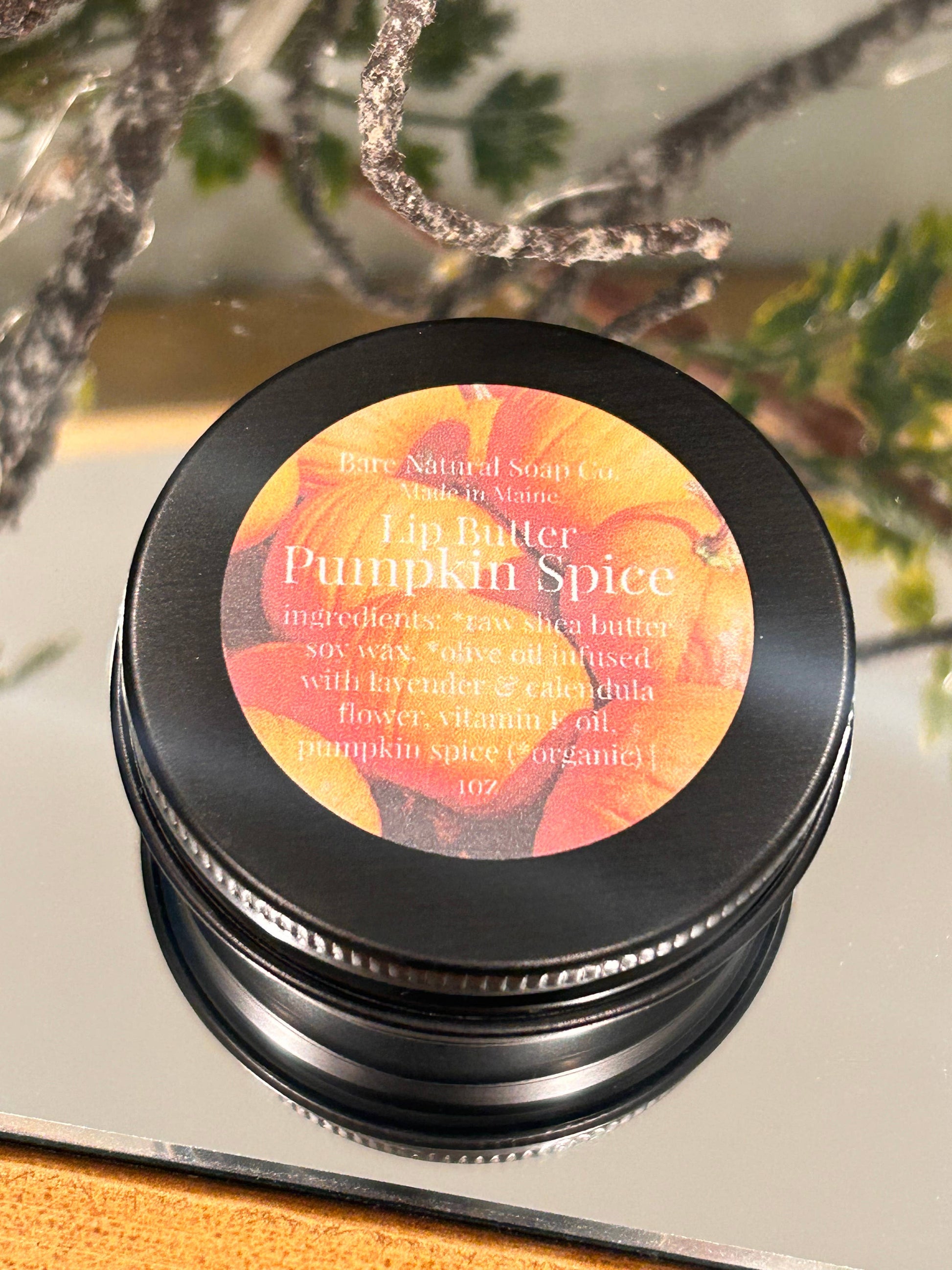 Pumpkin Spice Calendula Lip Butter | All-Natural | Vegan | Made in Small Batch | Made with love in Maine | Calendula Infused Lip Balm Simple | Natural | Nourishing A silky vegan lip butter that hydrates and soothes parched lips while sealing in moisture for lusher-than-life lips on demand day or night. Calendula is popularly used in herbal medicine for its wide range of benefits - including antifungal, antimicrobial, anti-inflammatory, and antioxidant properties. Our ultra-indulgent lip butter leaves lips looking smoother and feeling softer, thanks to an infusion of Soy Wax, Raw Shea Butter, Cocoa Butter, *Olive & *Coconut Oil, Oil infused with homegrown *Calendula & *Lavender, *Pumpkin Pie Spice & Vitamin E Oil (organic) ** Oils infused for 6-8 weeks. Our Lip Butter is an amazing base for lip stains and lipsticks to protect and deeply hydrate the lips without compromising your color. 1oz. tin black tin.