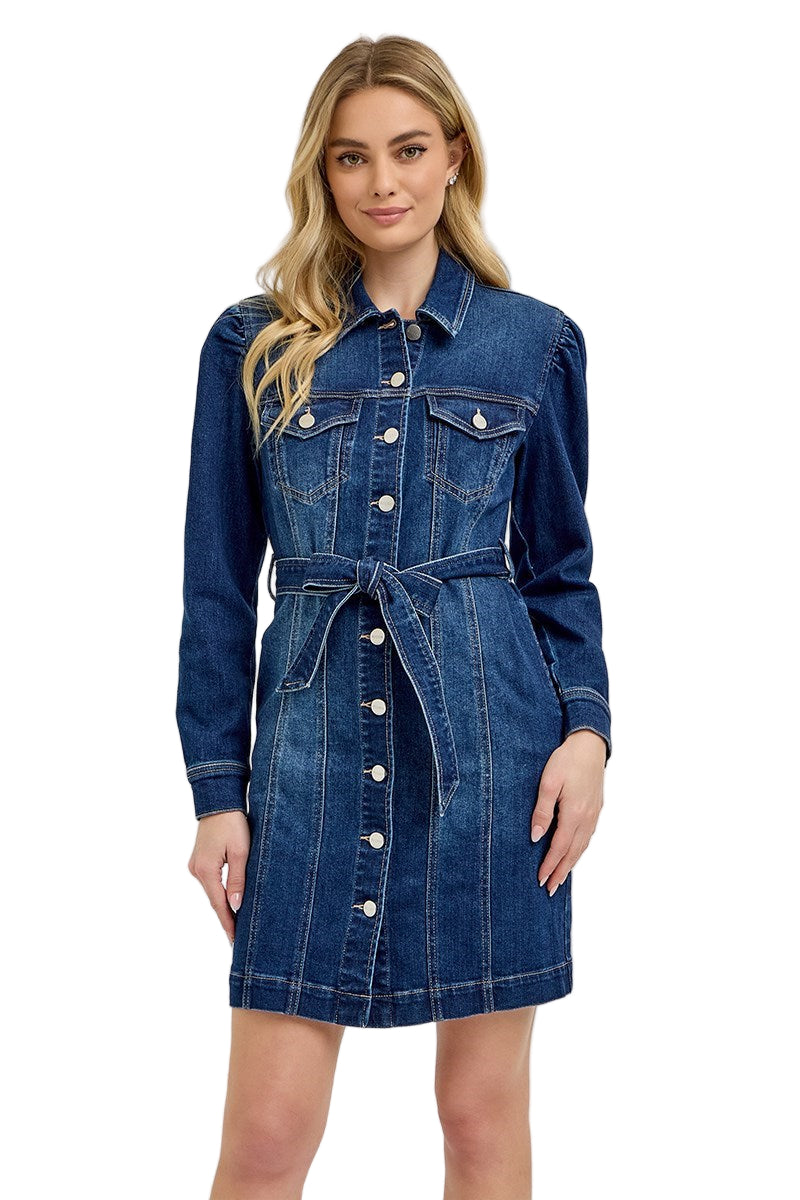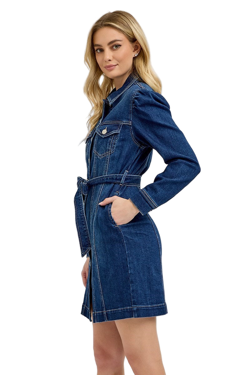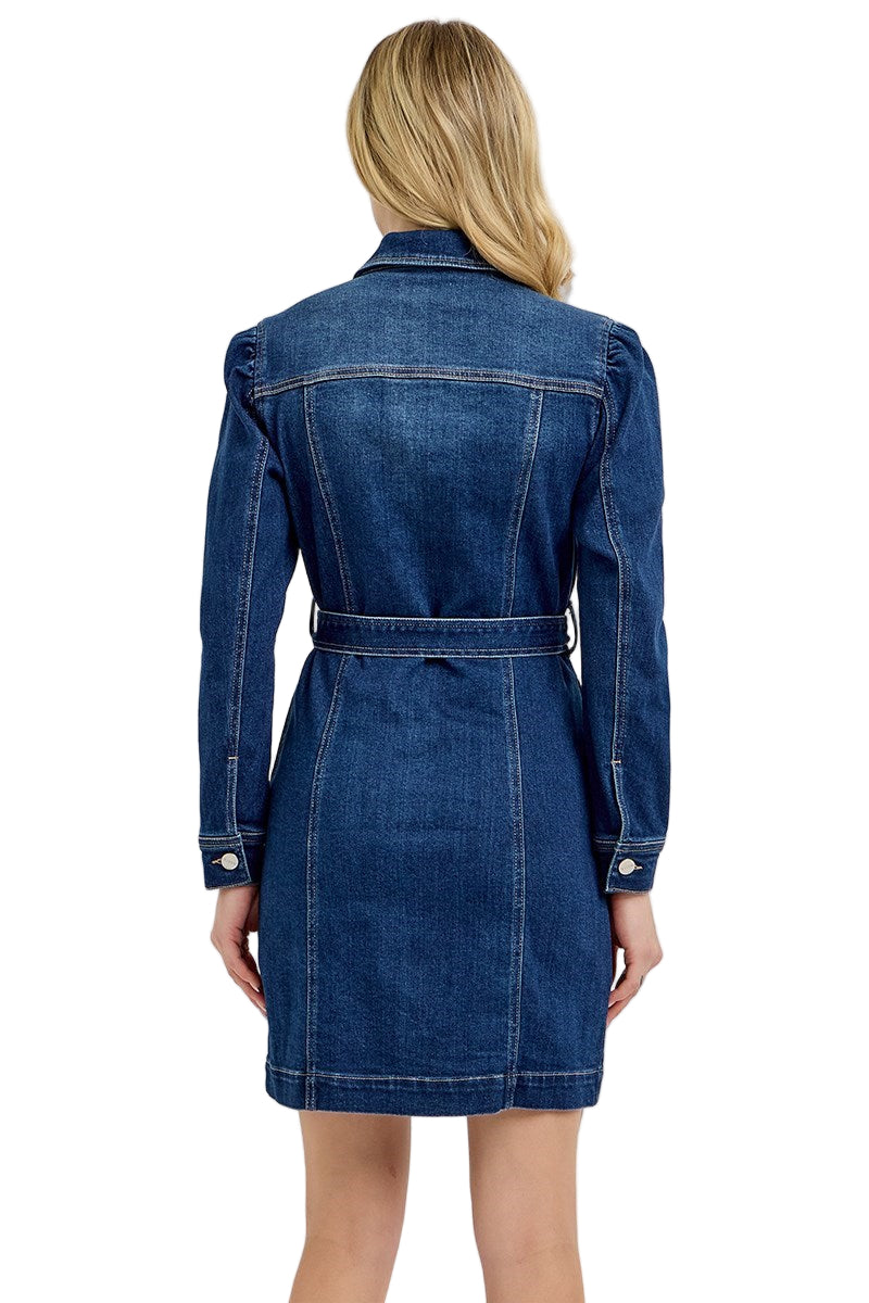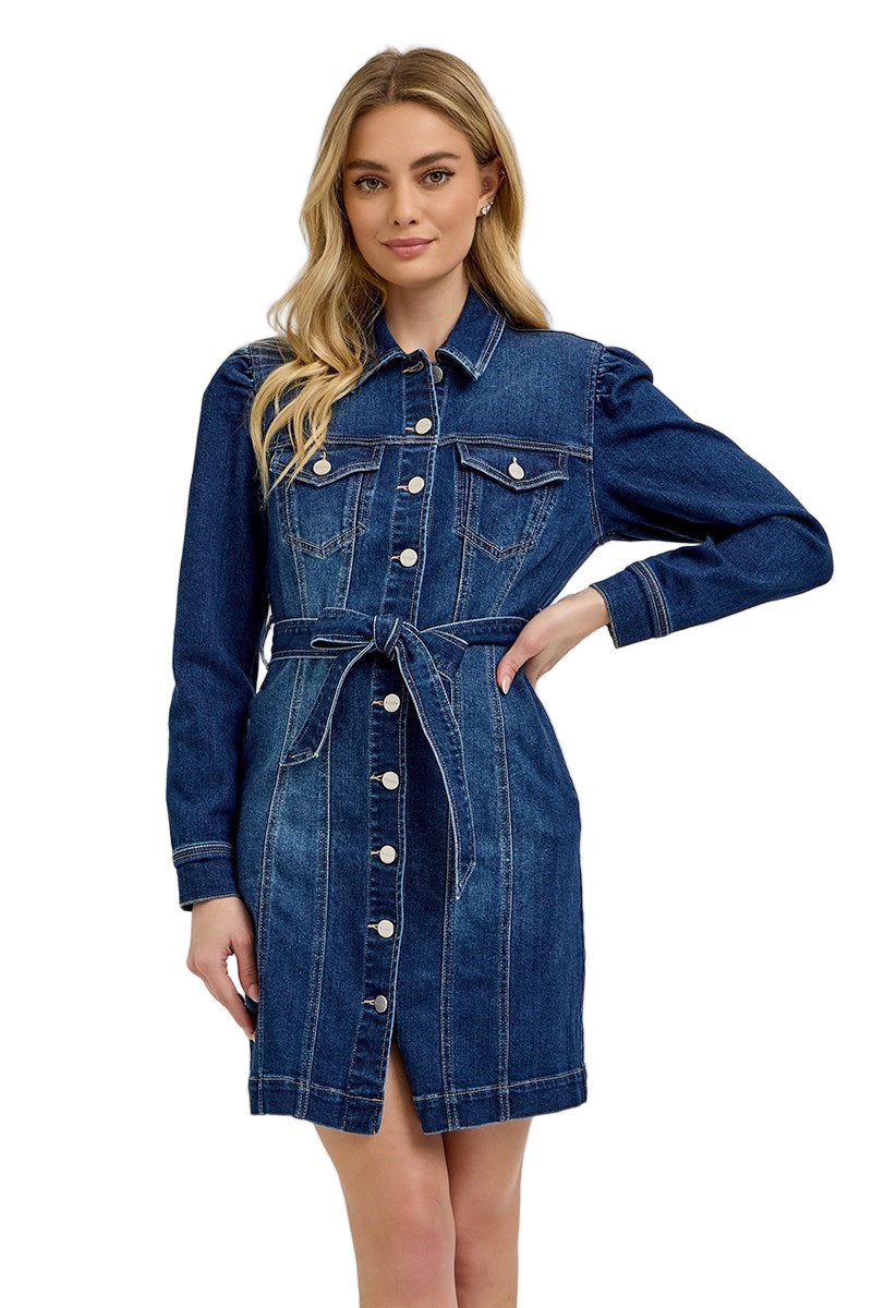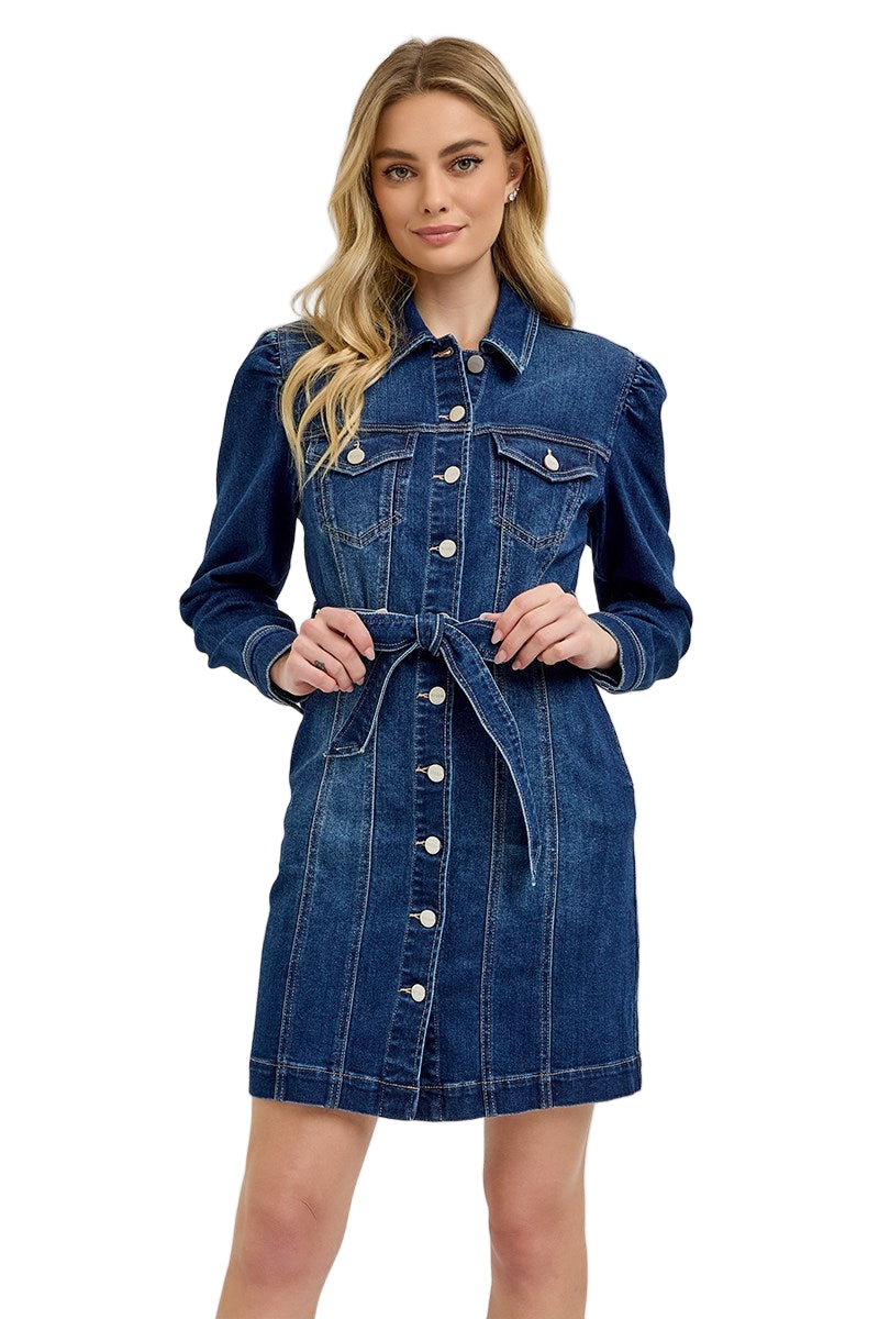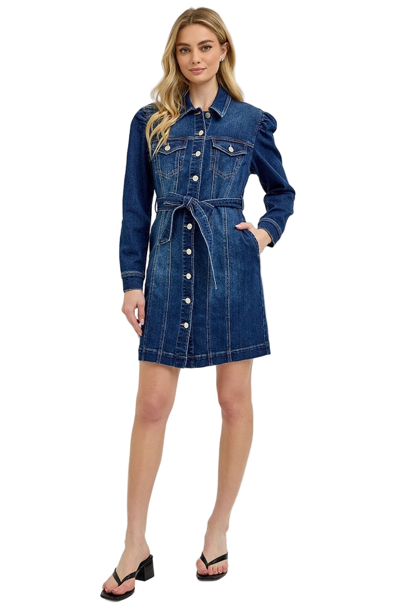 The Risen Puffed Sleeve Denim Dress combines classic denim with a modern silhouette, featuring voluminous puffed sleeves for added style. Crafted from a durable yet comfortable blend of 93% cotton, 6% polyester, and 1% spandex, it offers slight stretch for ease of movement. With a 32 1/4" length and a 35" chest measurement in size S, it provides a flattering fit just below the armpit. Perfect for those seeking a structured yet feminine dress, it balances timeless fabric with contemporary design, modeled here on a 5'8" figure wearing size S.