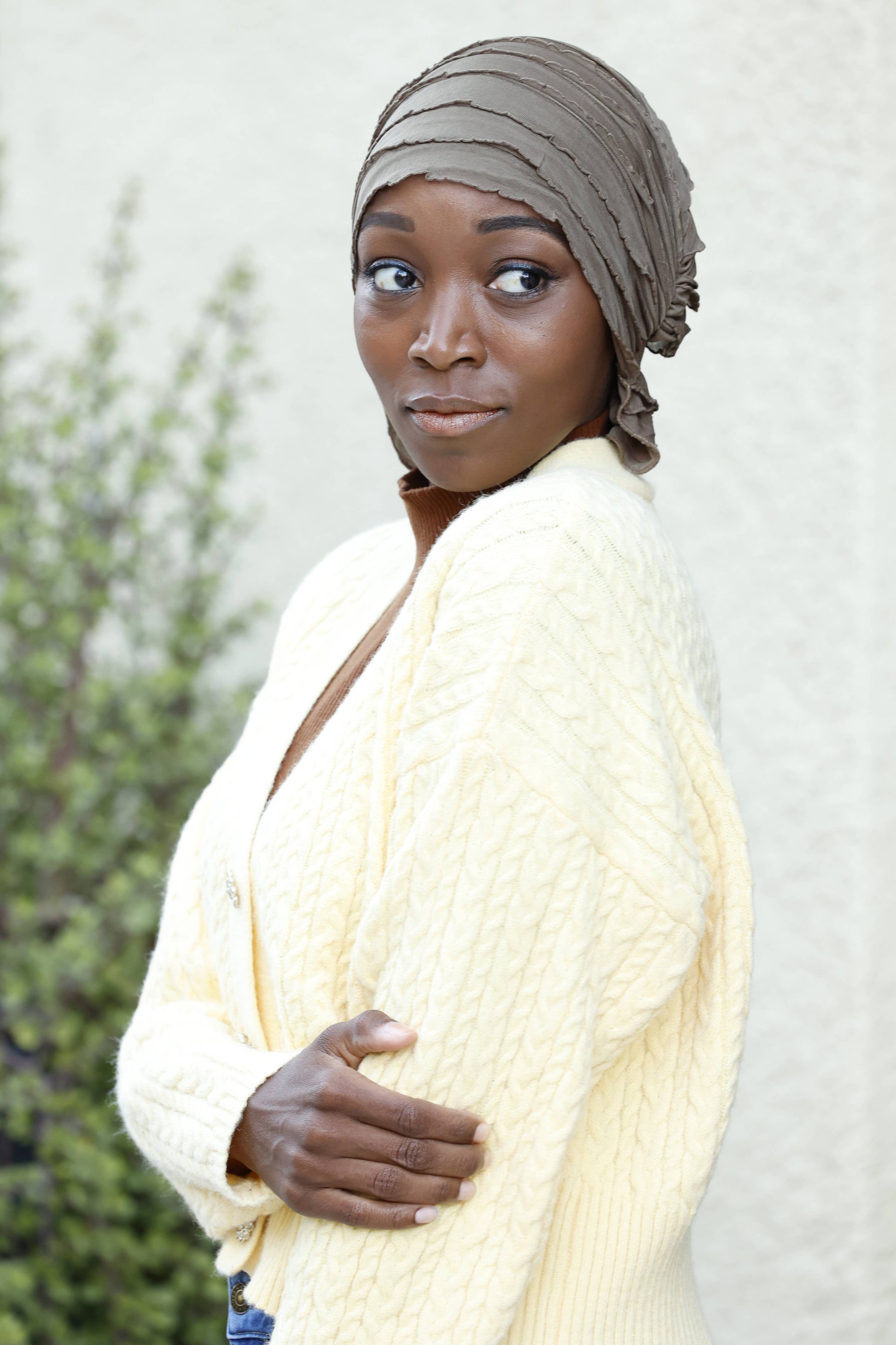 Mocha Ruffle Signature Slip-On beanie adds feminine volume, producing the subtle look and feel of having hair. The unique elastic design stretches for a comfortable and easy fit. Slips on and off with ease; No tying necessary. Our patented design features a fluent fabric flap for a polished look that provides full coverage around the nape of the neck. Chemo Beanies® ends the search for the perfect fashionable fit and allows women to spend precious time focusing on their healthcare, not their headwear.