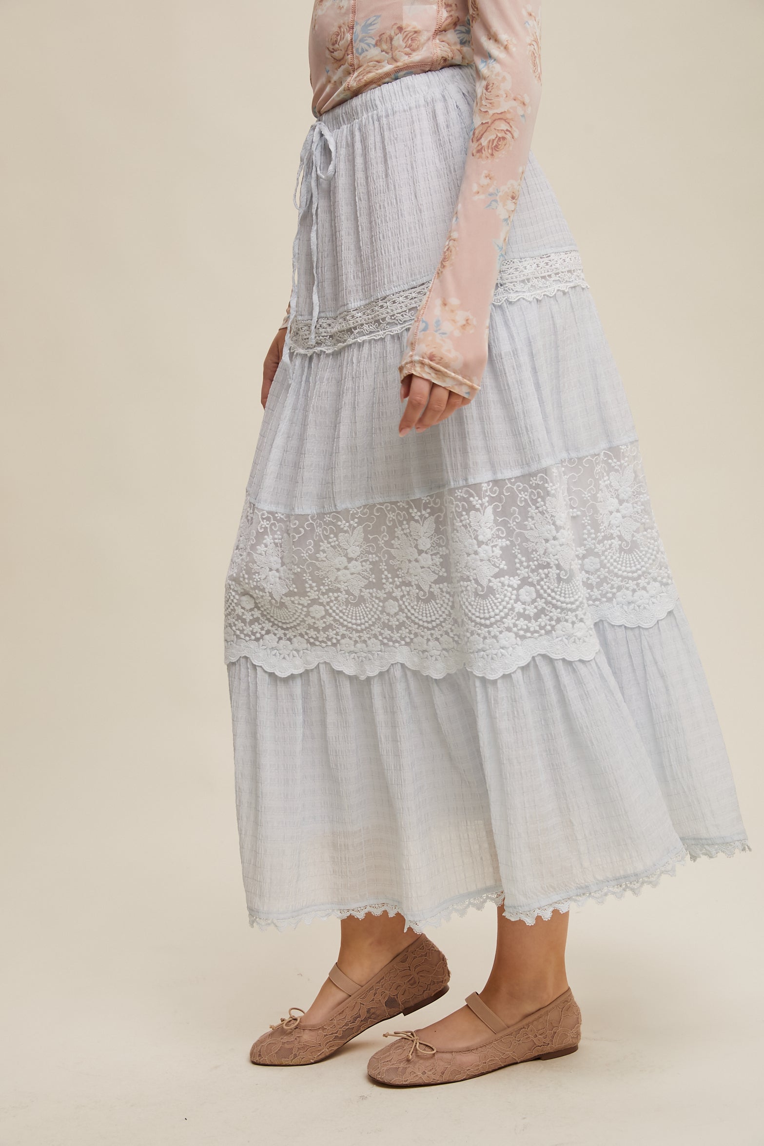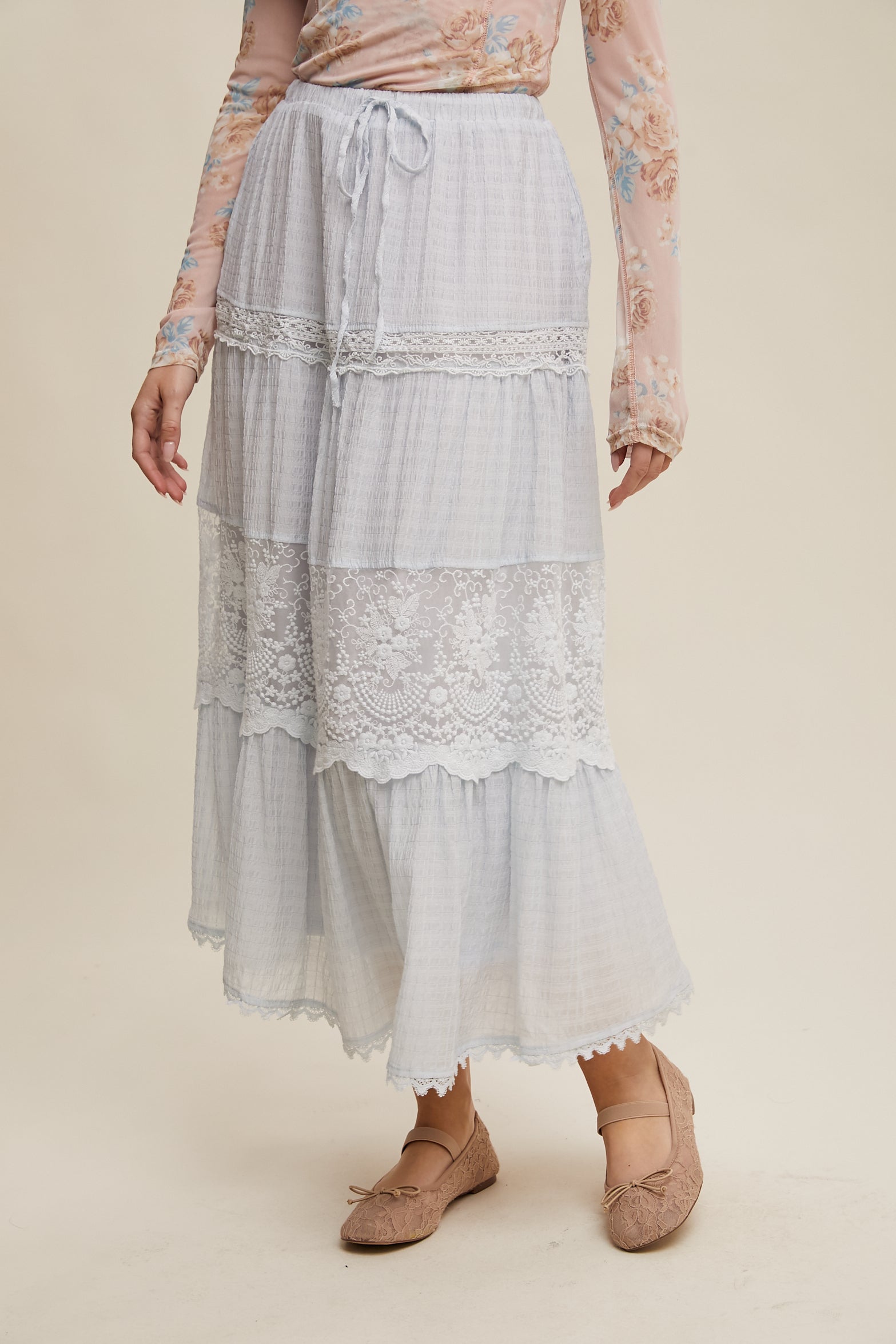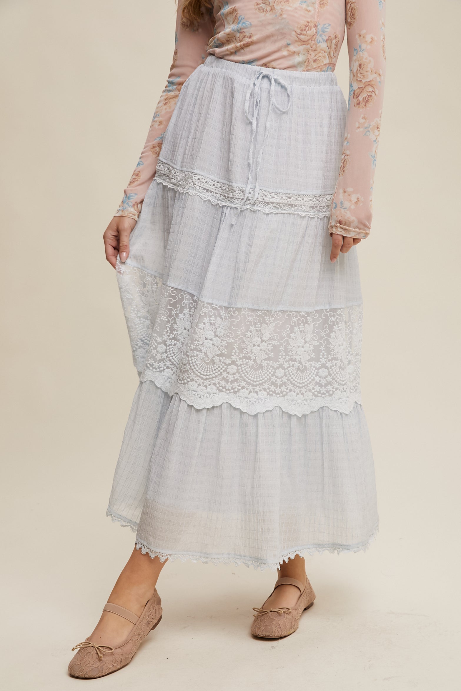 - Model is 5' 8" 30-24-34.5 and wearing a size Small. This flowy tiered skirt with intricate lace accents offers a whimsical, boho-chic vibe. Perfect for casual outings, romantic brunches, or outdoor garden parties. Pair it with a fitted top and boots for a statement look or sandals for an effortlessly chic style.