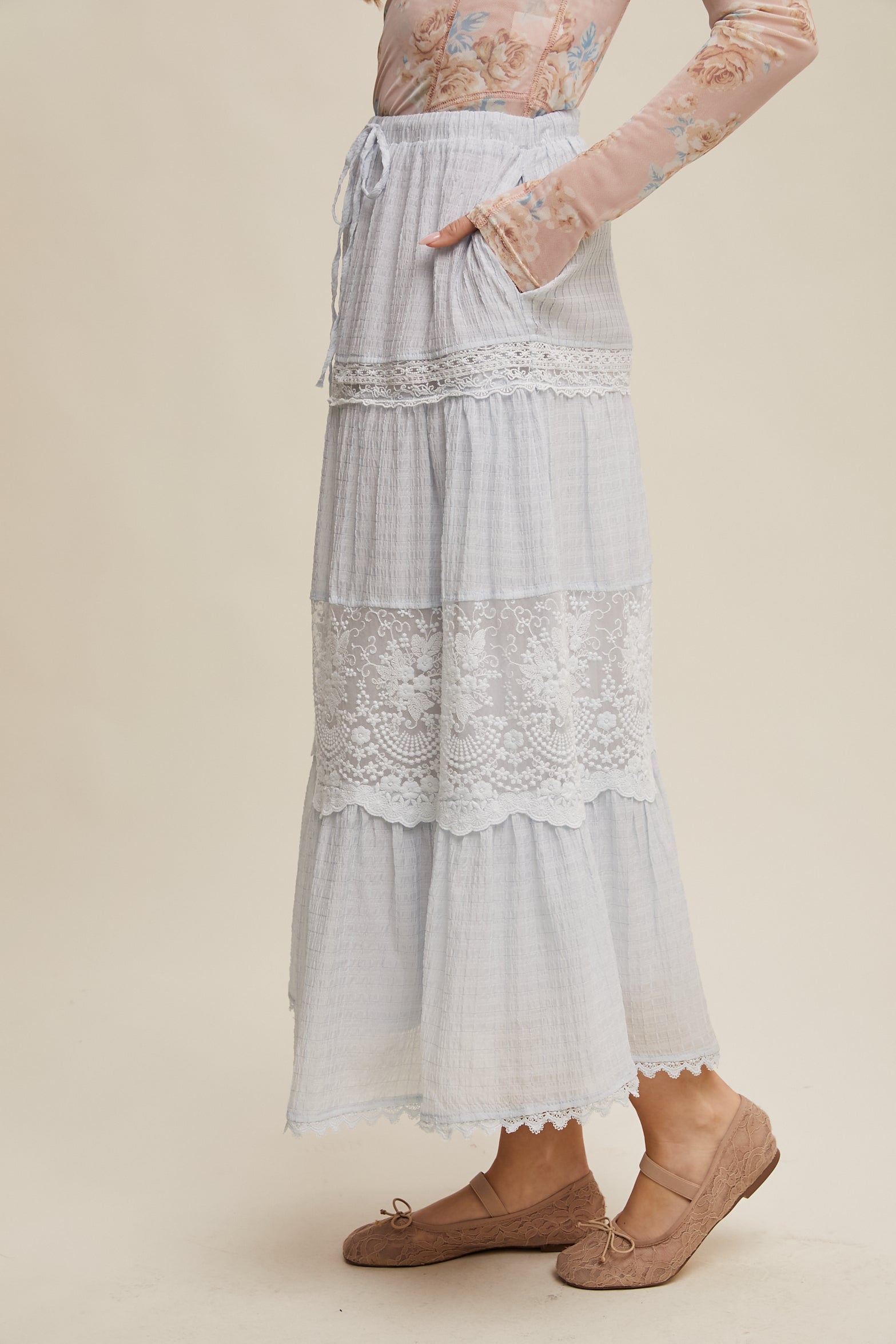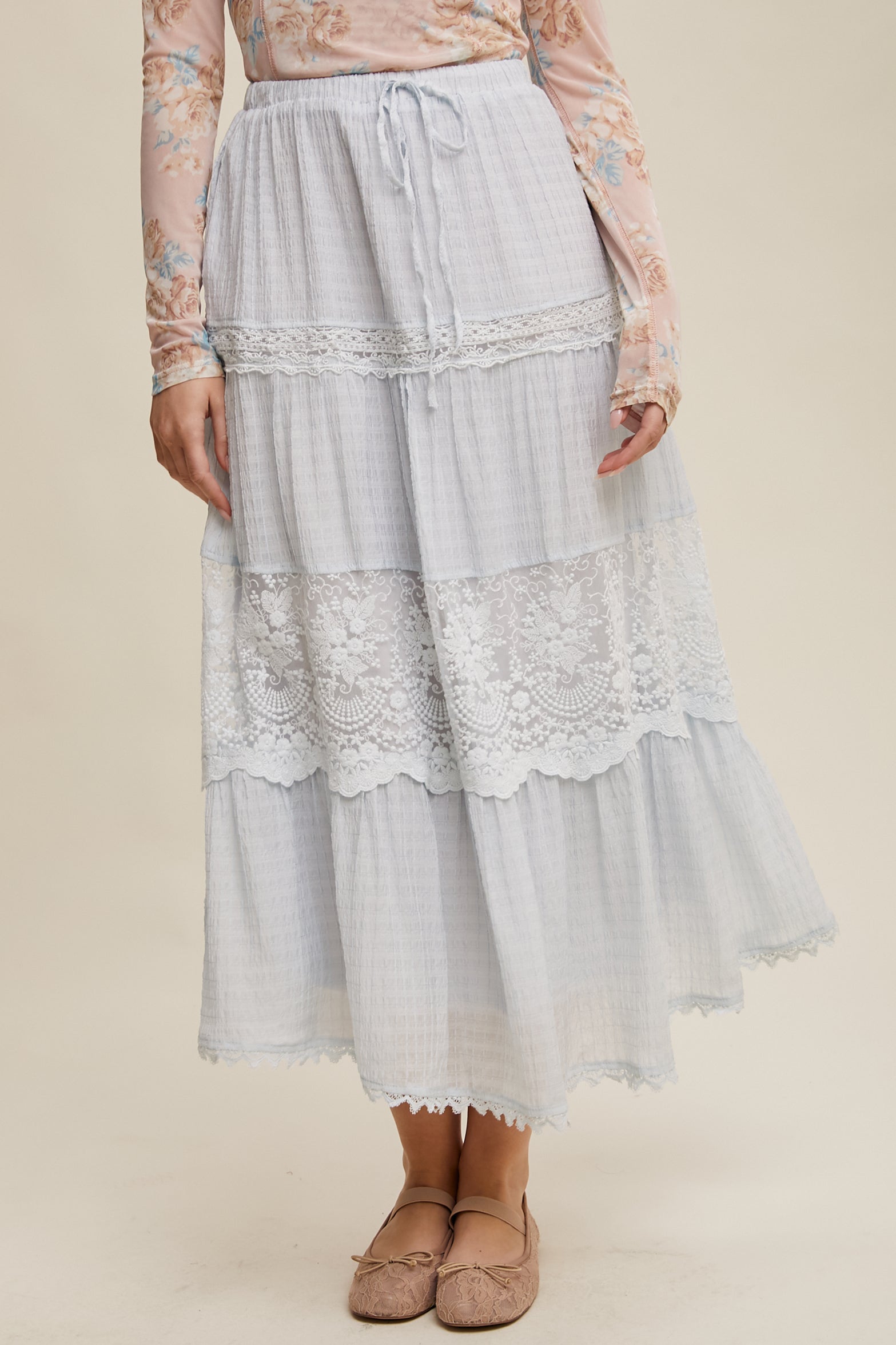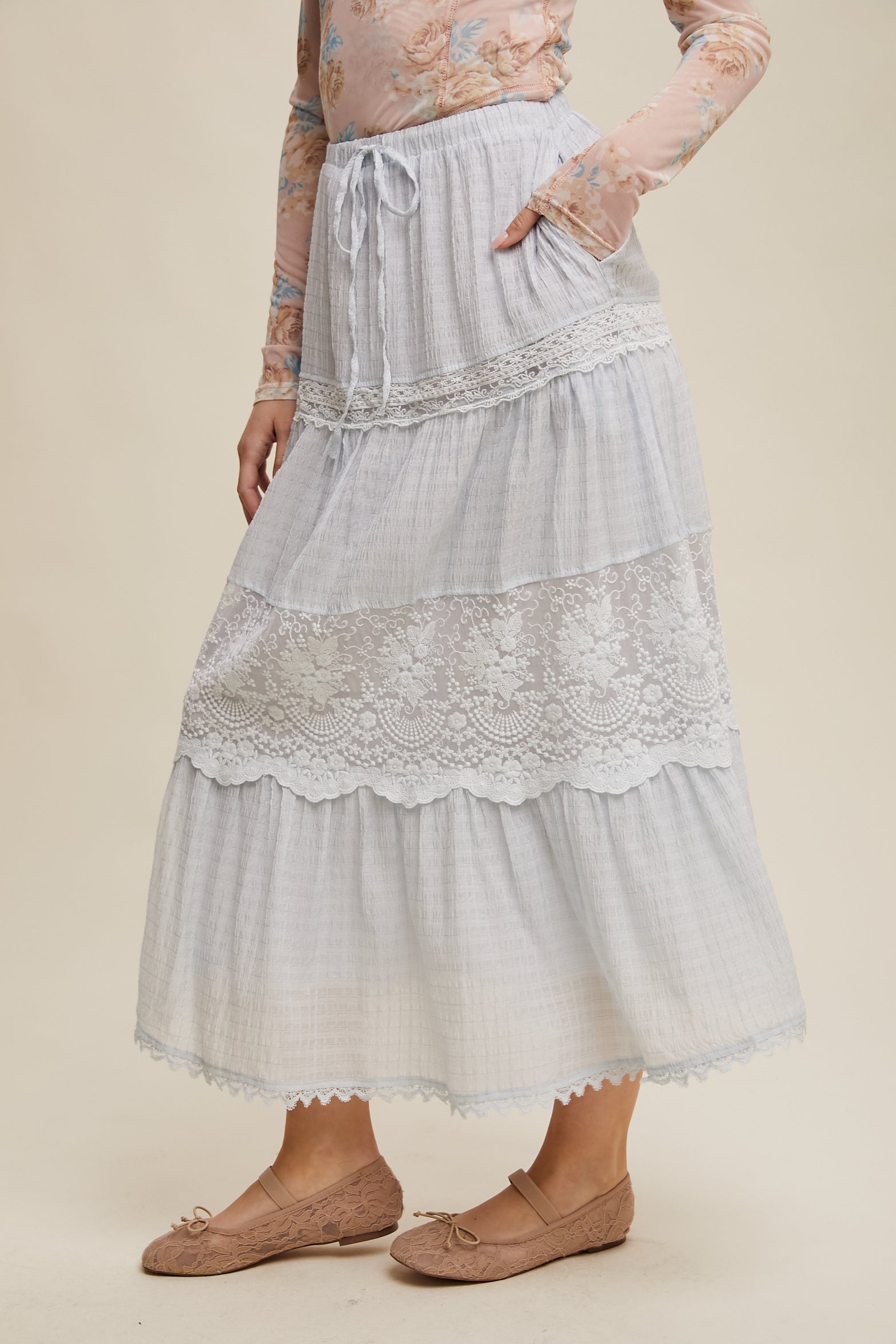 - Model is 5' 8" 30-24-34.5 and wearing a size Small. This flowy tiered skirt with intricate lace accents offers a whimsical, boho-chic vibe. Perfect for casual outings, romantic brunches, or outdoor garden parties. Pair it with a fitted top and boots for a statement look or sandals for an effortlessly chic style.