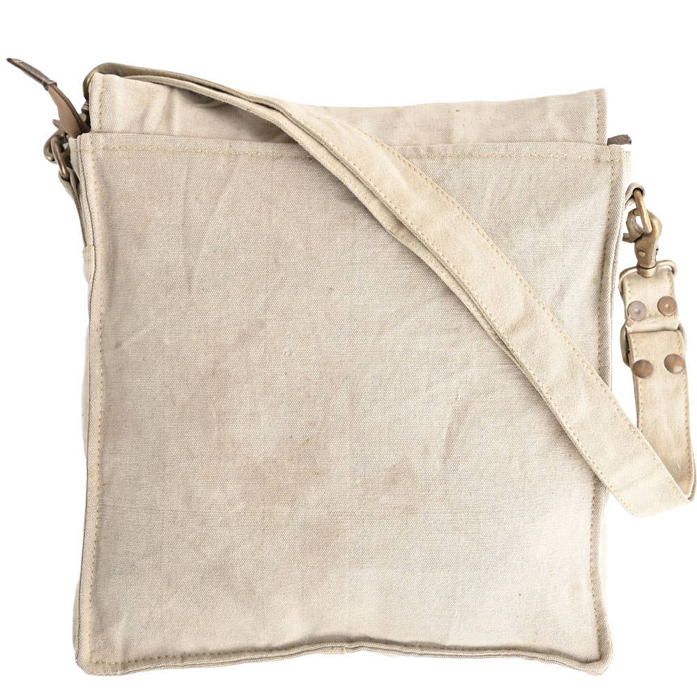 This bag is hand crafted using re-purposed canvas and military tents.