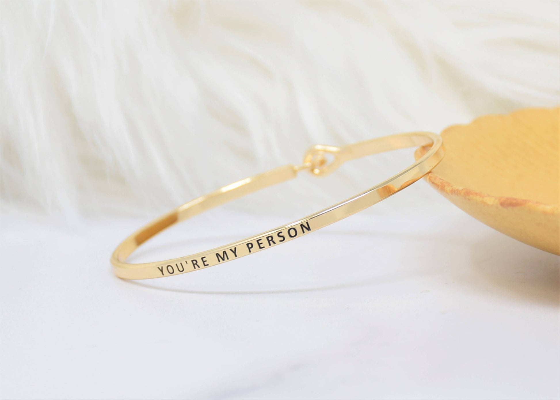 Dainty Inspired Message Engraved Simple Bangle Bracelet. Inspirational bracelets that make for an excellent and meaningful gift for yourself, friends and loved ones. These are subtle, elegant, and beautiful alone or stacked creatively. We have an array of messages that you can mix and match to your heart's content. Wear it with purpose and care! Details: Premium high-quality band with hook closing Size: ranged from 1.5 mm thickness Diameter: 2.5 inches Circumference: fits up to 7 inches Wrist (please use a measuring tape to circle your wrist) Designed in the USA: Creative Messages This bracelet is made of and consists of a hook that is rhodium plated.